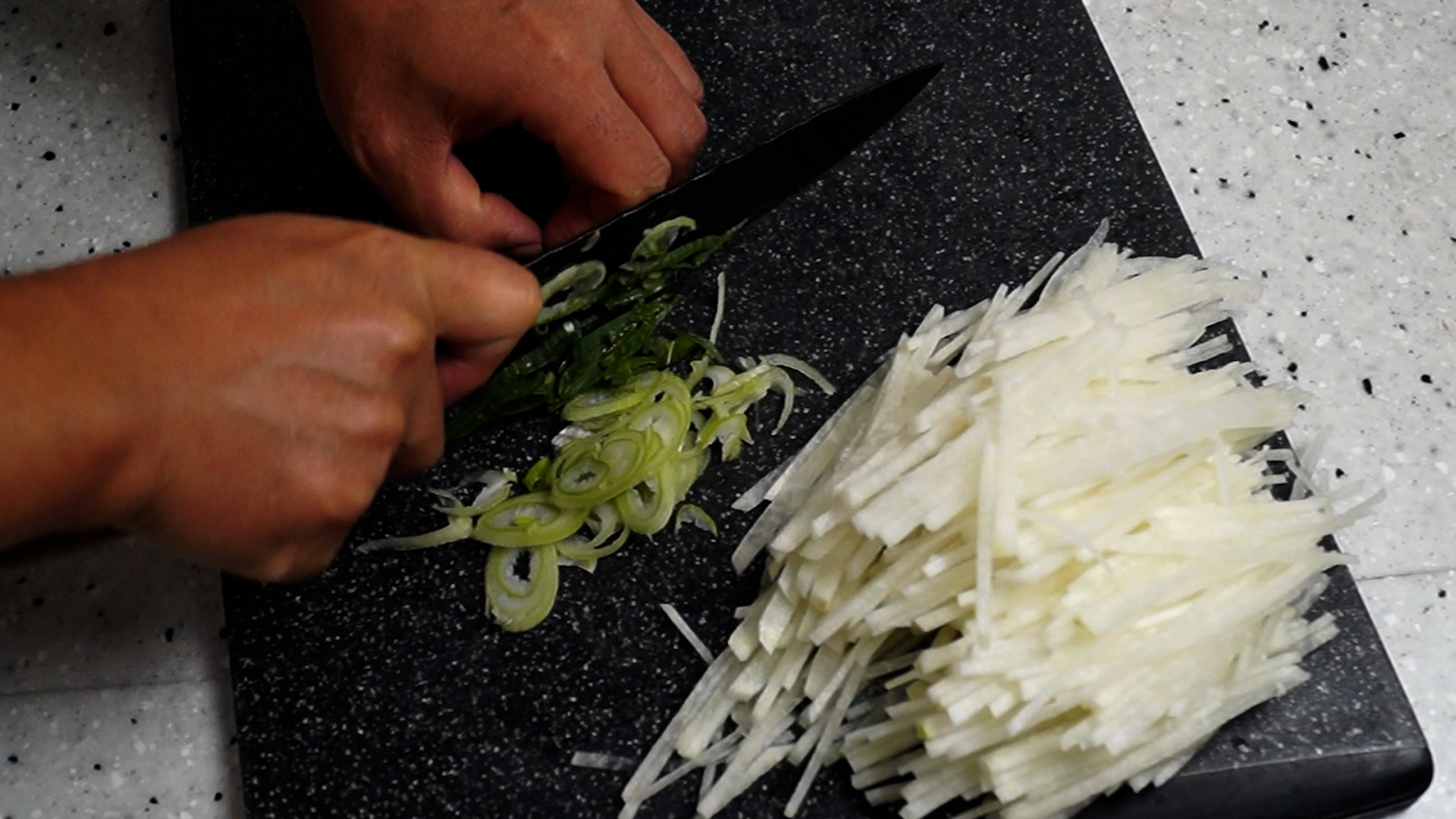 1. 무우를 1~2mm 두께로 좀 얇게 채를 썰어줍니다. 칼질에 취미 없으시면 채칼로 밀어주세요. 무우마다 다르겠지만 검지 2마디 4~5cm 한토막이면 대략 300g 됩니다.