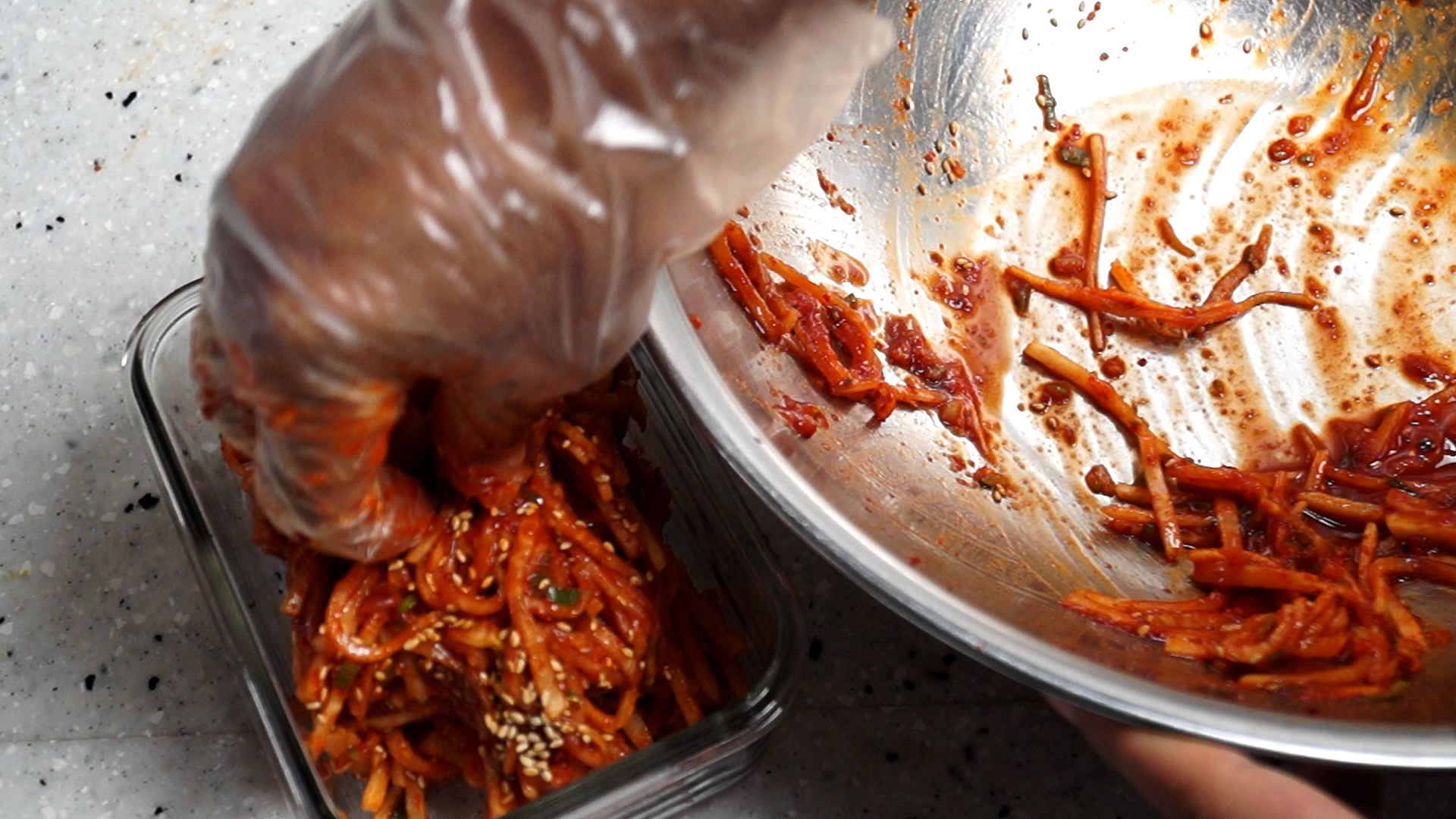 4. 무채에 빨간물이 들때 까지 가볍게 섞어서 10분 정도 방치를 하세요.