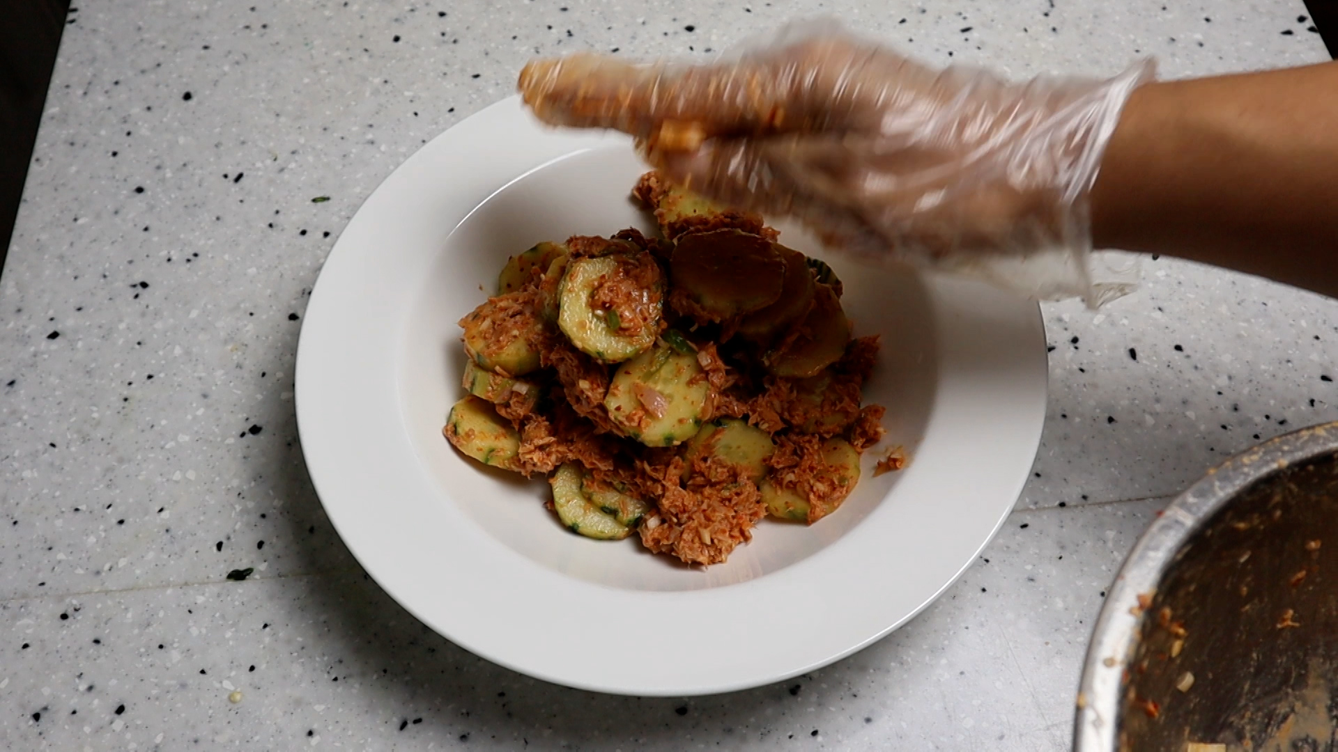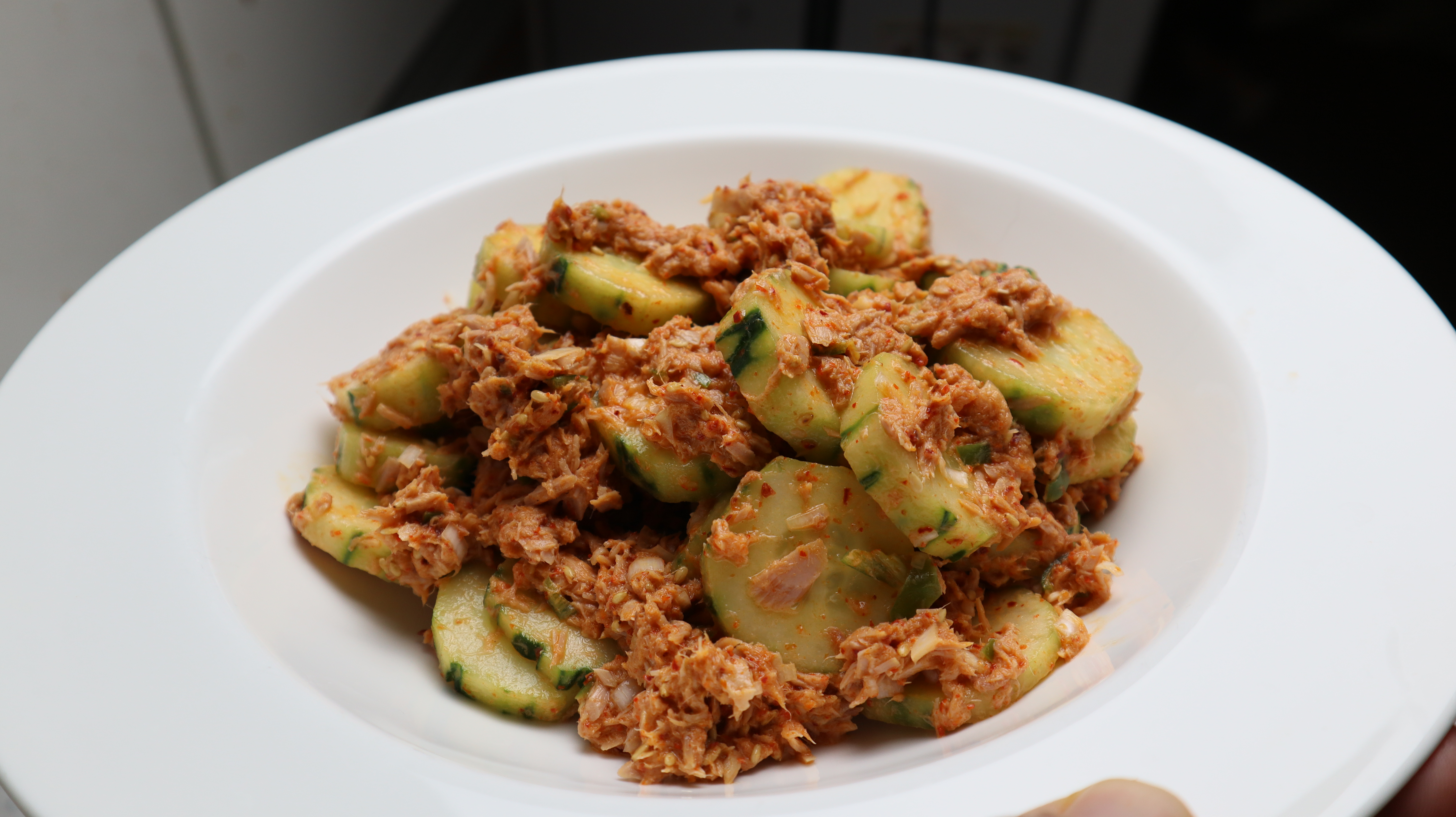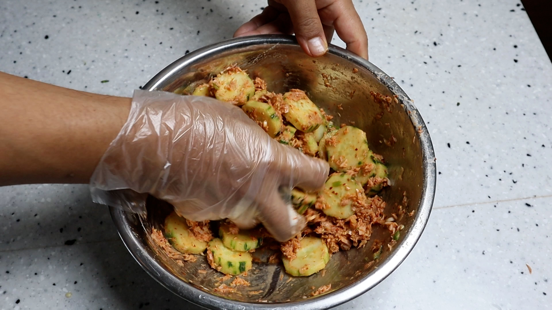 6. 볼에 참치 건더기를 넣고 오이,대파,땡초 전부 넣기