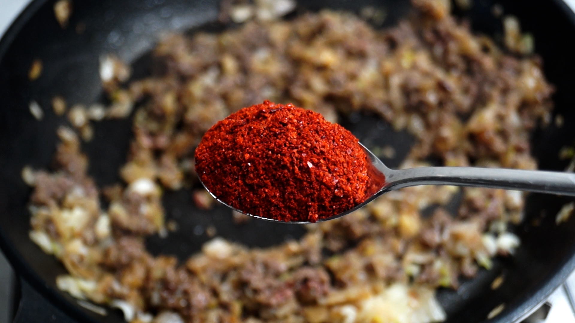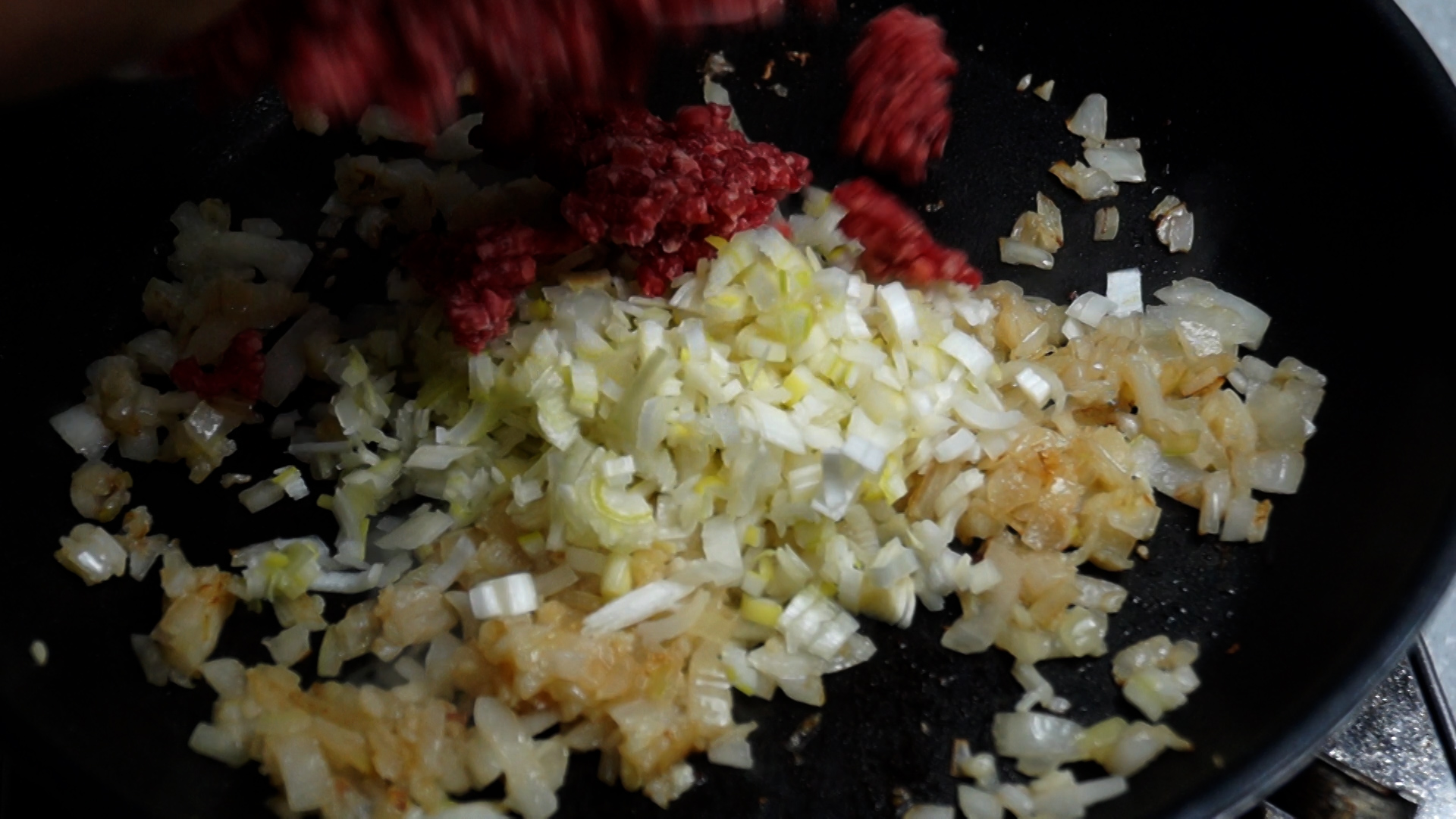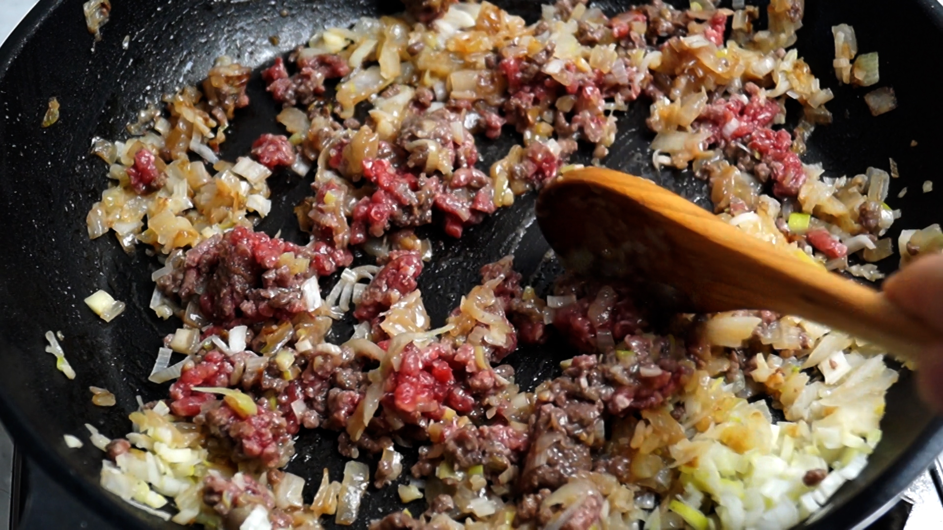 6. 소고기 다짐육을 넣어주세요. 양념이 워낙 진한 편이라 핏물제거 하나 안 하나 웬만해선 구분하기 힘들지만 좀 더 깔끔하게 해 드시려면 다짐육을 찬물에 10분 정도 담가 핏물을 빼주시거나 키친타월로 꾹꾹 눌러 핏기를 제거한 뒤 넣어주세요.