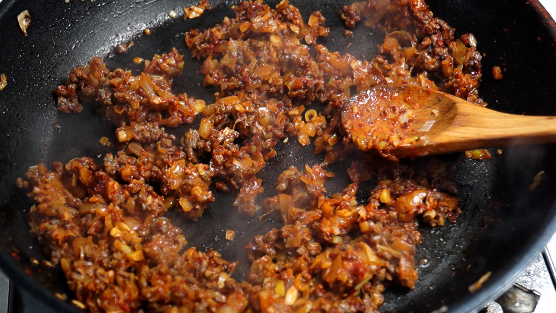 7. 다짐육이 뭉치지 않게 풀어가면서 대략 2분 동안 볶아주세요.