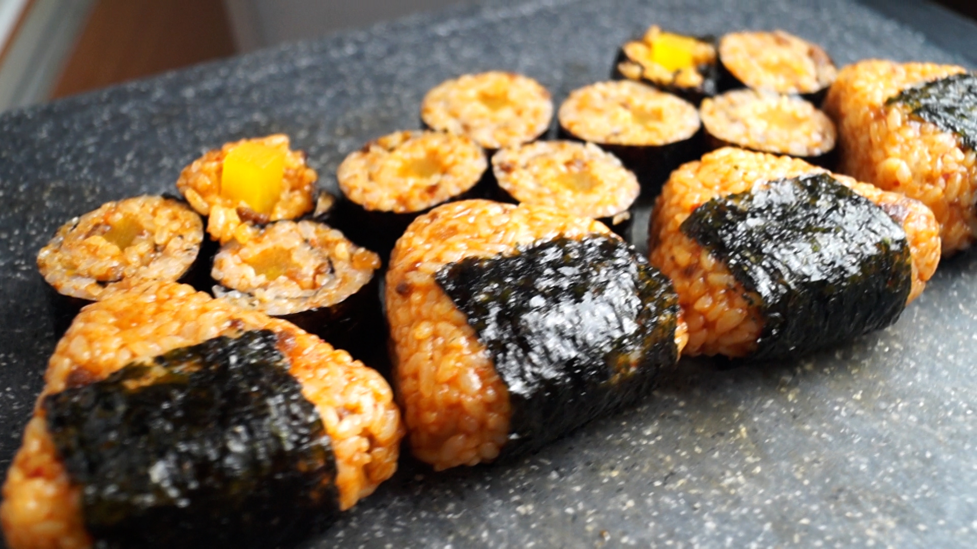 20. 기호에 따라 밥 비벼서 단무지 1줄 넣고 매콤김밥 만들고 삼각형으로 모양 잡아 김 1장 입혀주면 편의점에서 파는 전주 삼각김밥 그 맛이 10배 정도 업그레이드 된 맛이 난답니다!