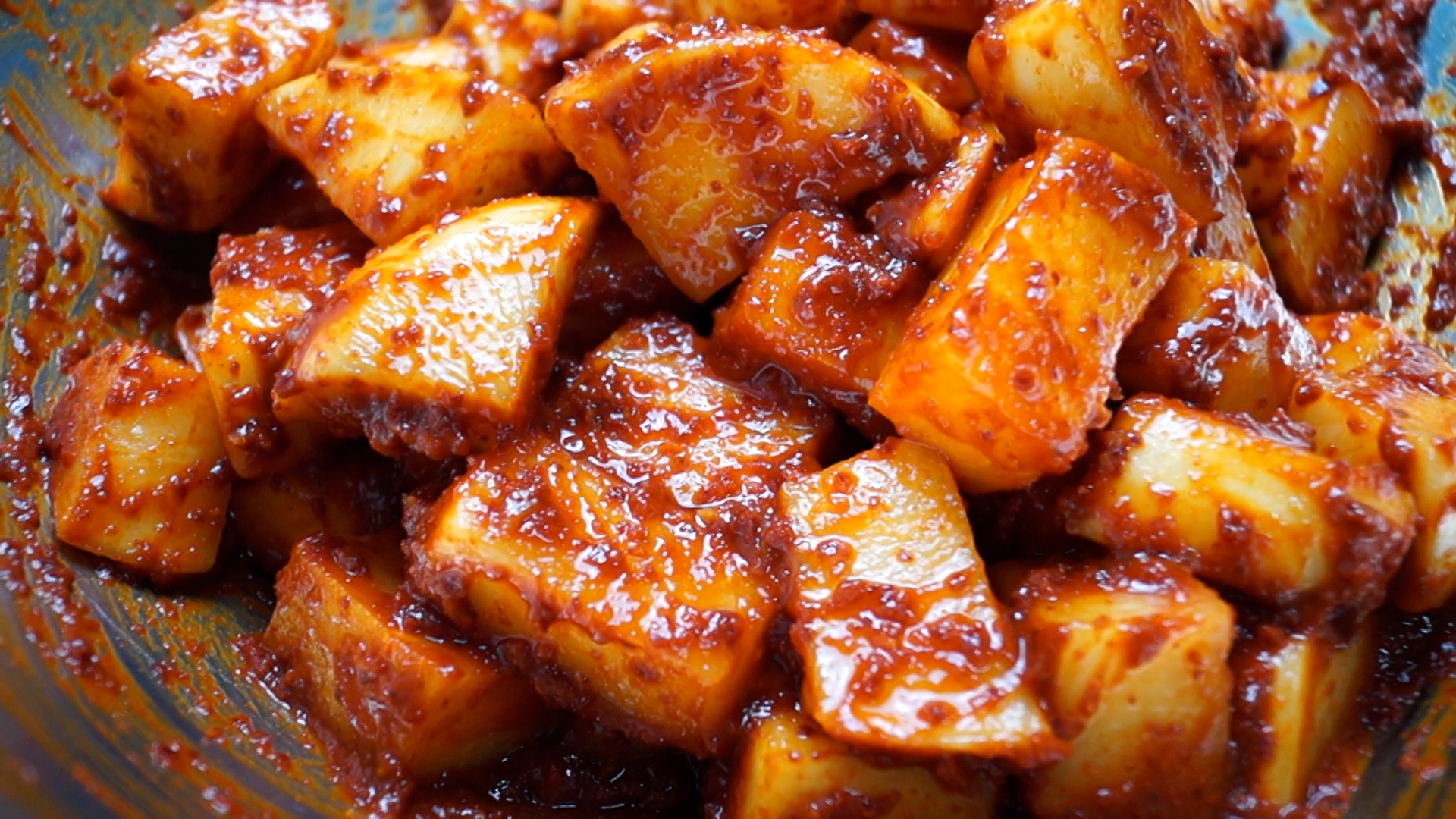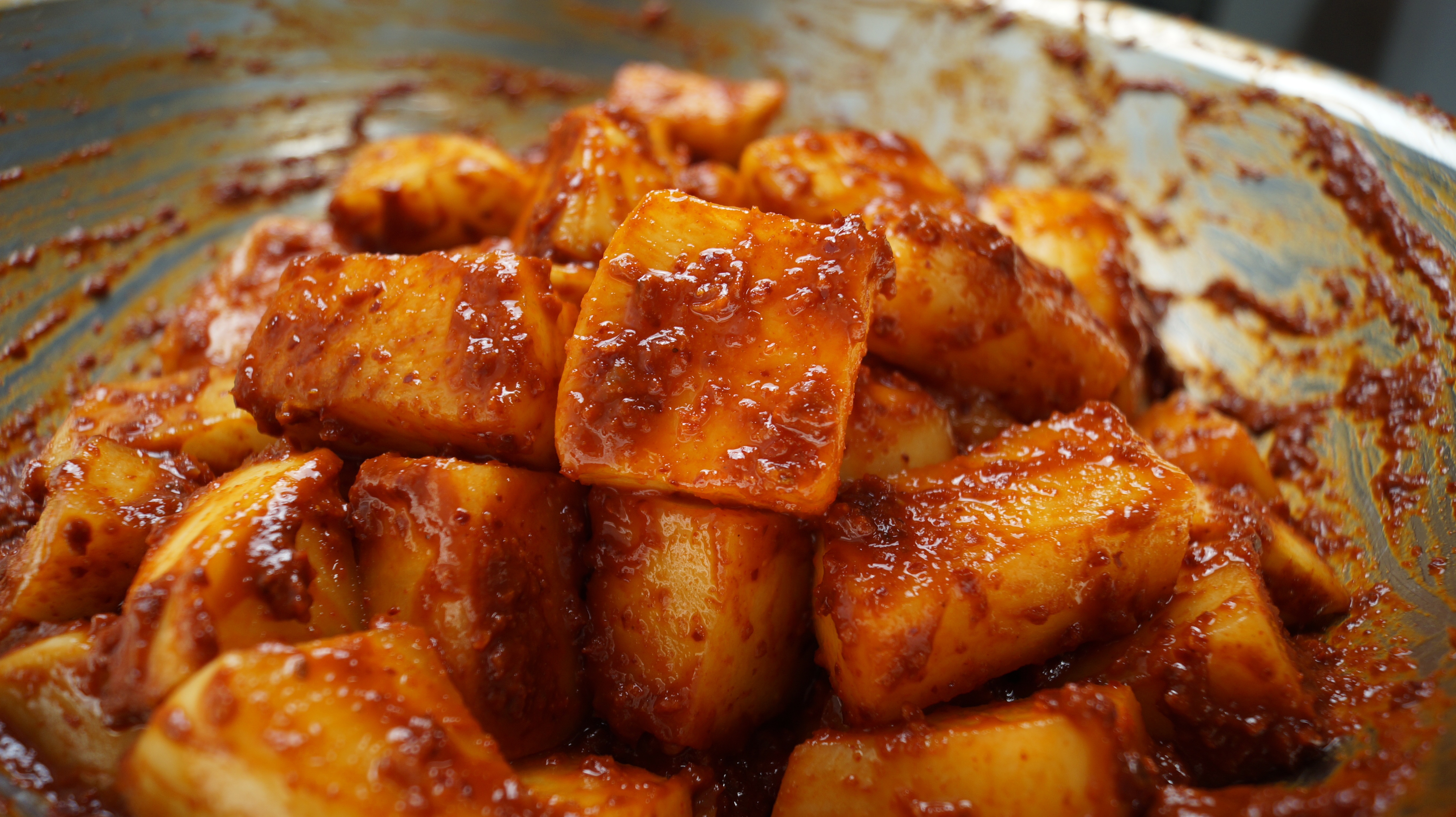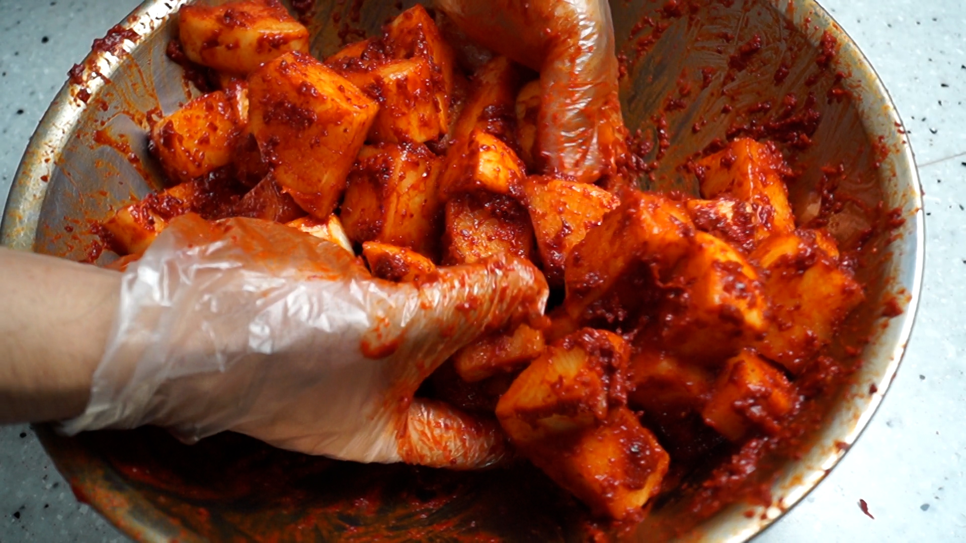 17. 양념을 우선 80% 만 넣고 버무리다가 색감이 좀 멀겋다면 양념을 더 넣고 버무려주세요. 무우 양이 많다면 모든 재료를 절반으로 줄여서 만드시면 됩니다.