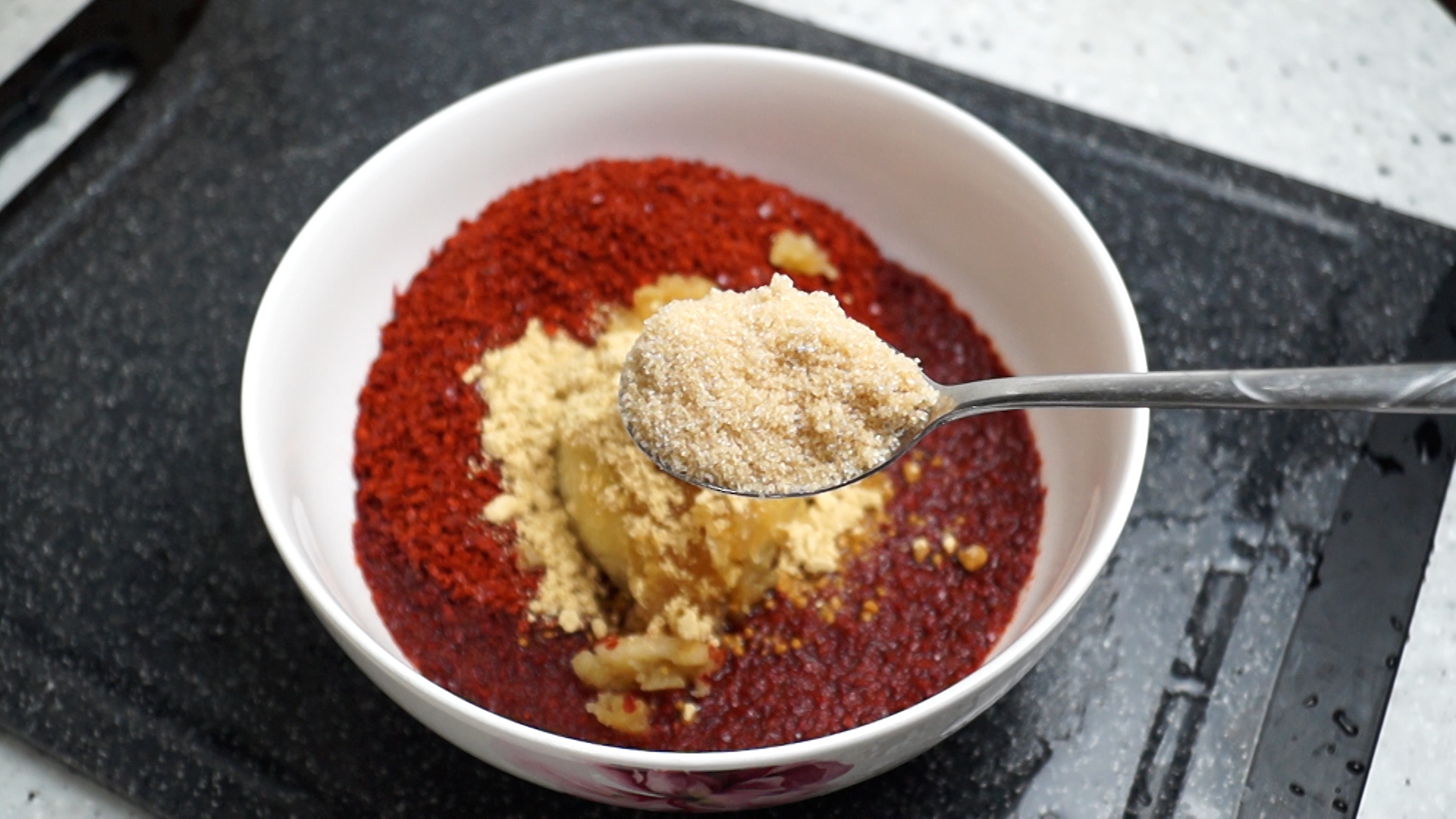 6. 양념란에 표기된 재료를 한데 넣어주세요. 고춧가루를 200cc 컵에 2컵 부어주세요.
