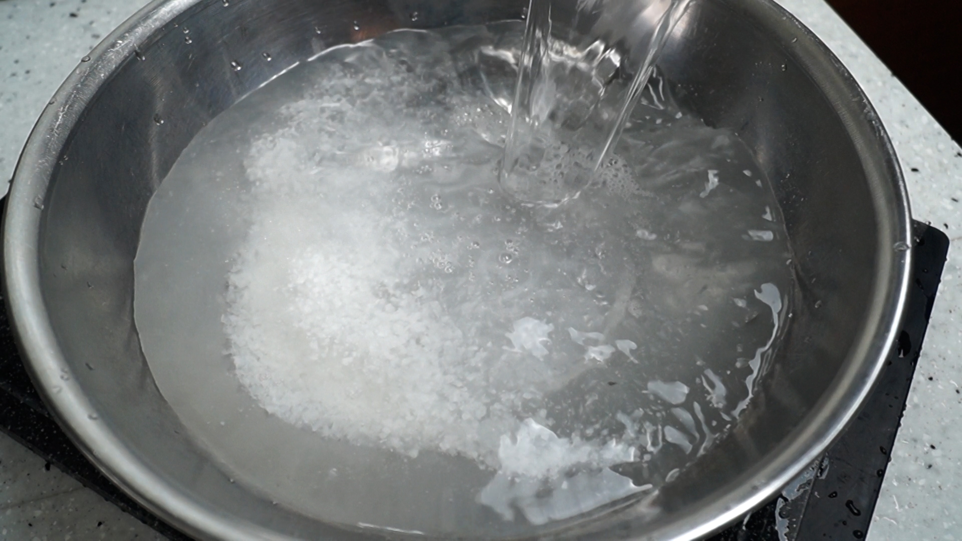 4. 물 4리터를 부어서 소금을 완전히 녹여주세요.