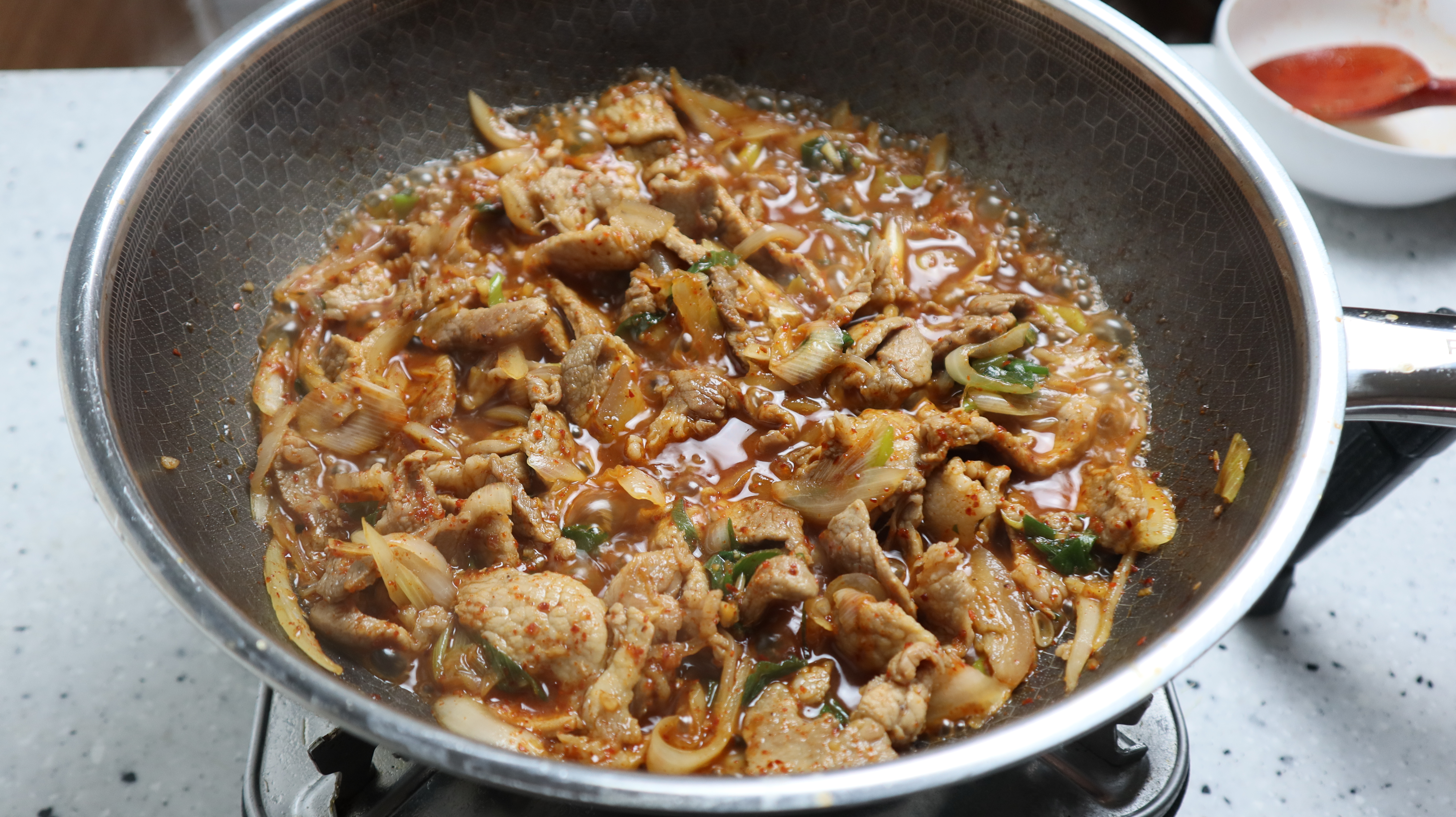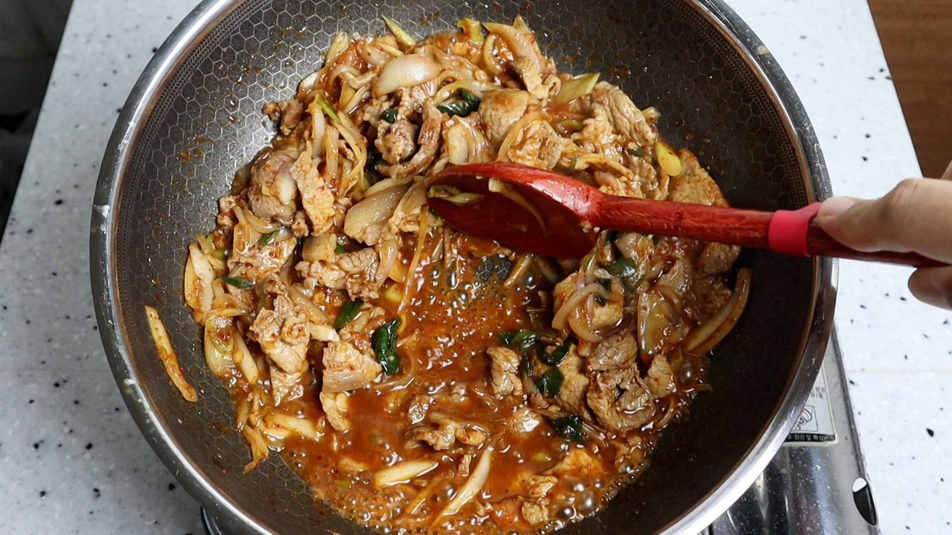 20. 2~3분 정도 볶으면 고기 기름에 양념이 맛있게 튀겨지면서 이렇게 절반 정도로 양념이 줄어 있을거에요.