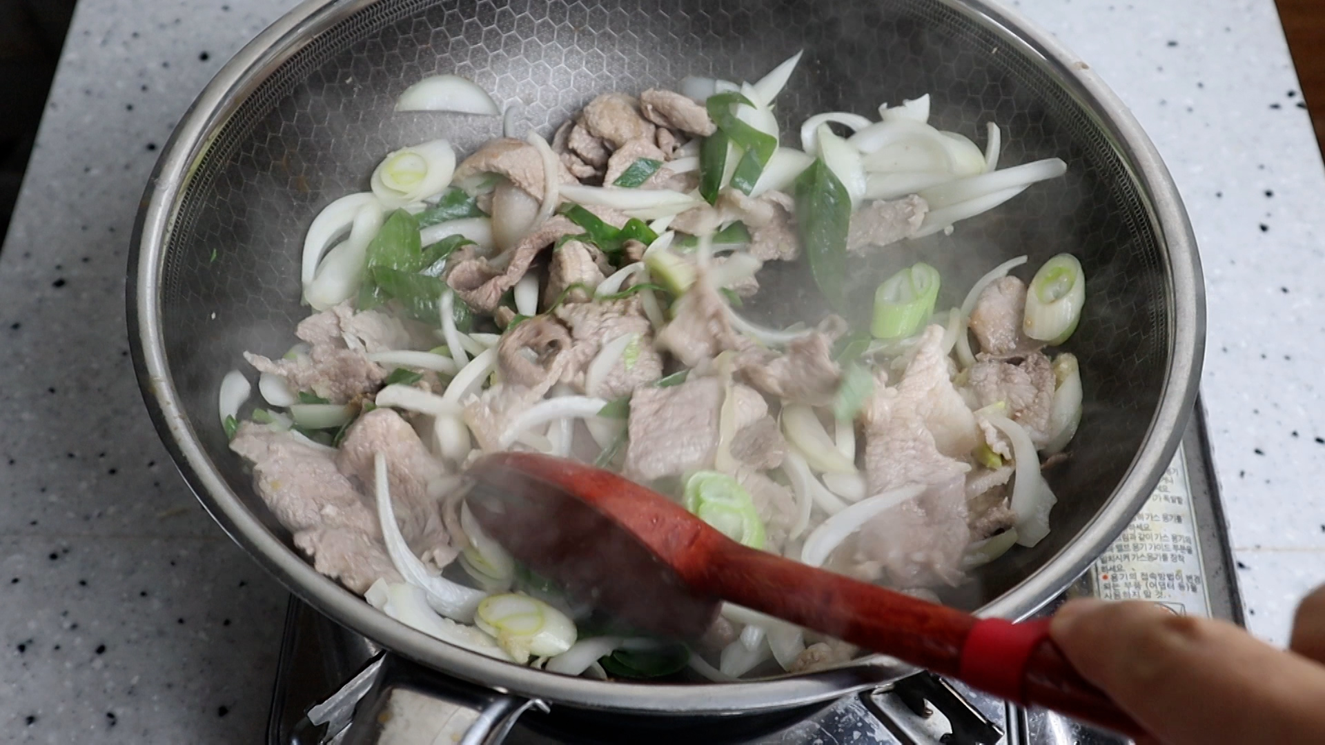 15. 강불로 달군 팬에 기름기가 적당히 있는 돼지고기 앞다리살 얇은거 400g 을 넣고 3~4분간 볶아주세요.