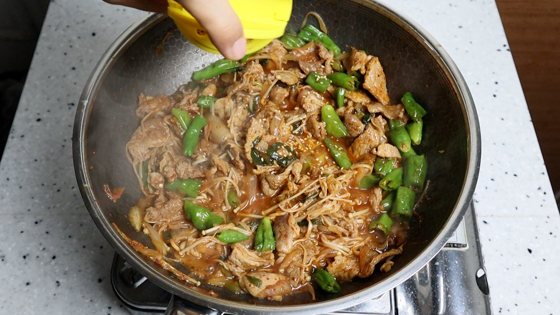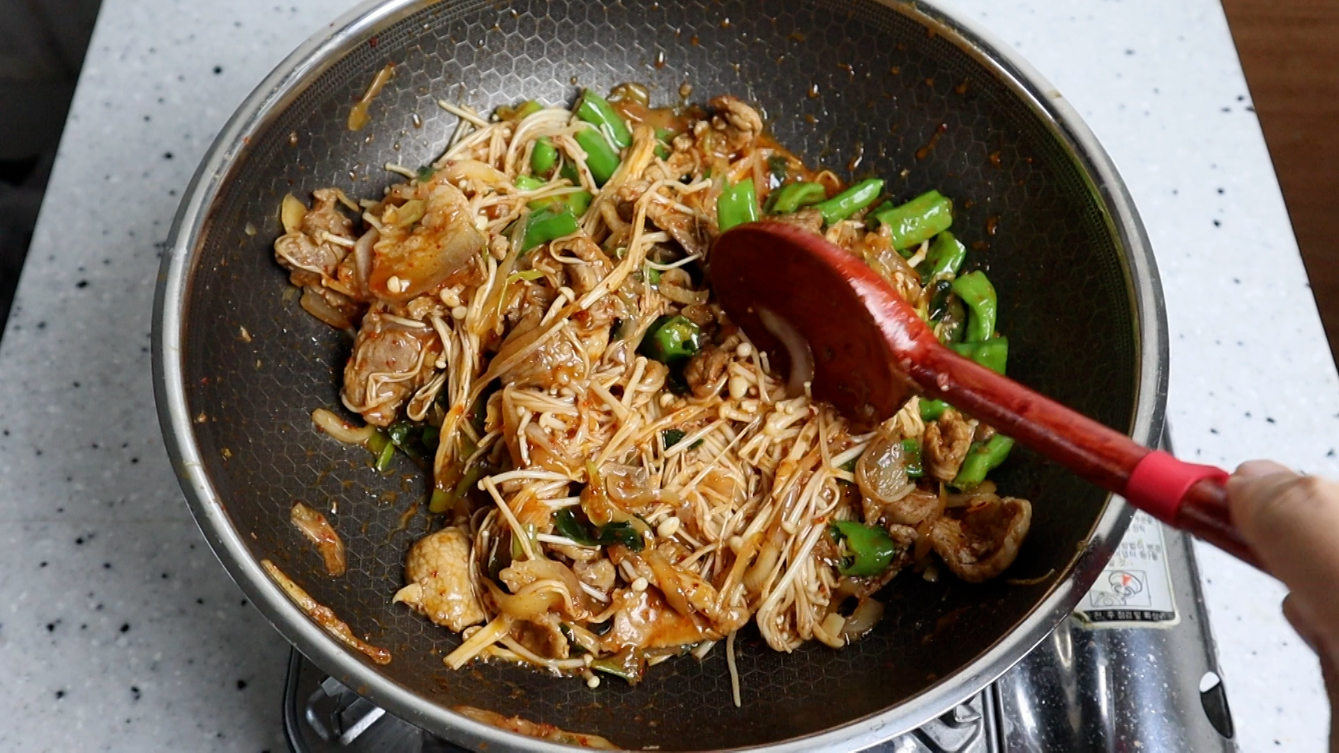 21. 팽이버섯과 꽈리고추를 넣고 30~40초를 더 볶아주세요. 너무 오래 볶으면 꽈리고추가 풀이 확! 죽어 버릴수 있으니 너무 오래 볶지는 마세요.