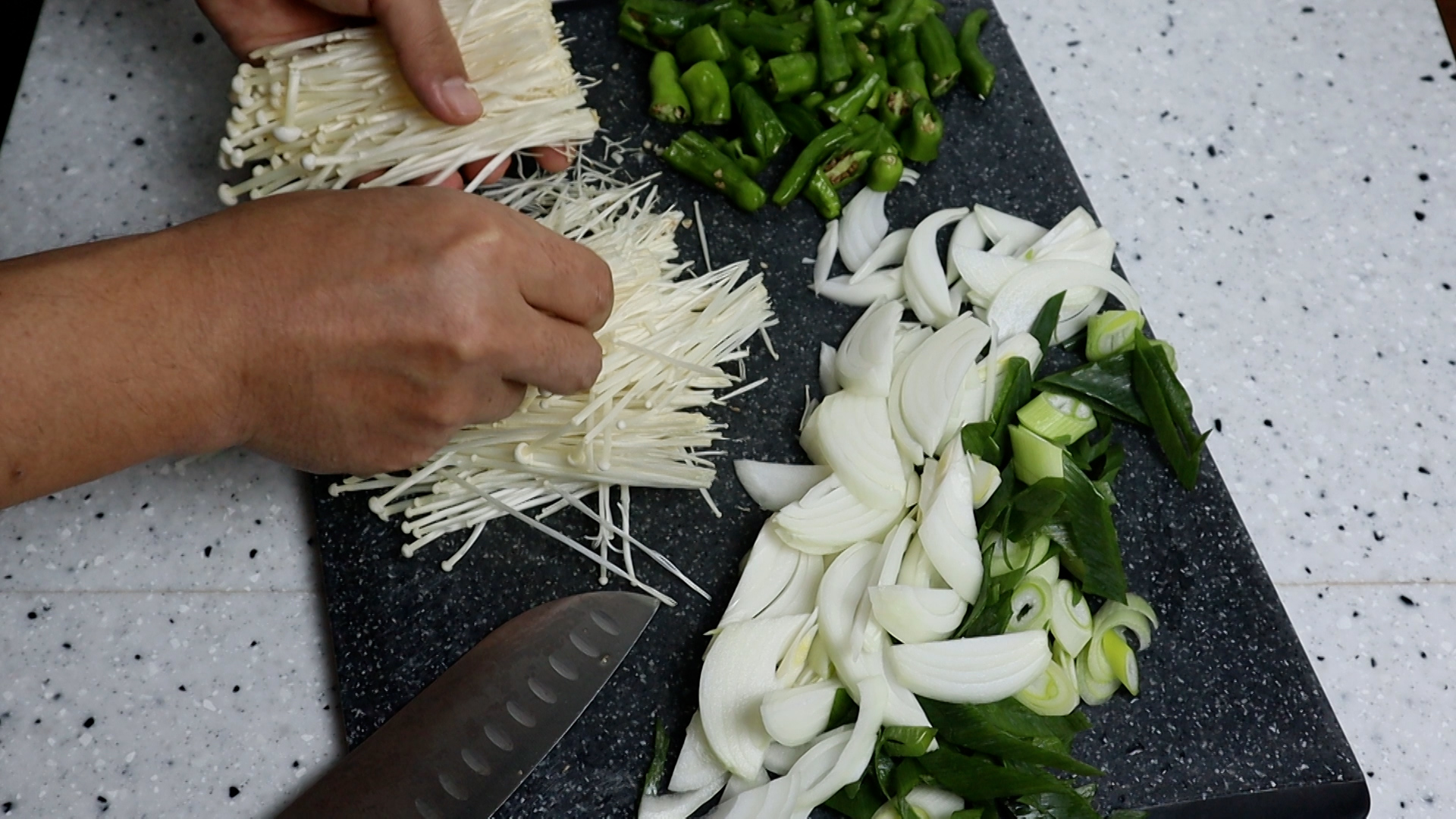 14. 팽이 버섯은 개인 기호에 맞게 5~10줄기로 죽죽 찢어주세요.