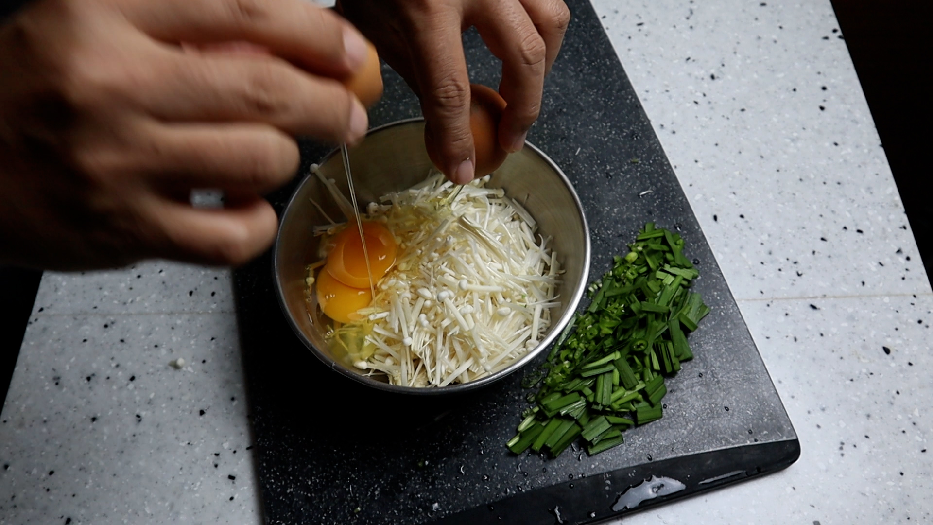 5. 팽이버섯을 볼에 넣고 계란을 대란 특란은 4알! 소란은 5알을 까넣어주세요.