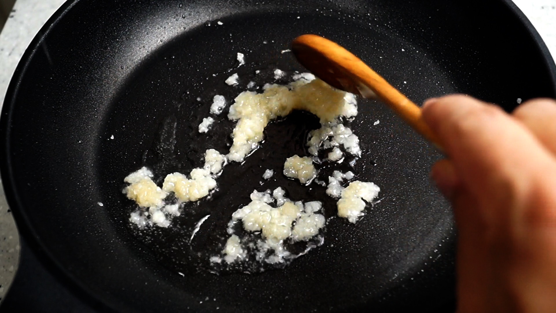 8. 불을 약불로 올리고 마늘이 자글거리기 시작하면 1~2분 정도 볶아주세요.