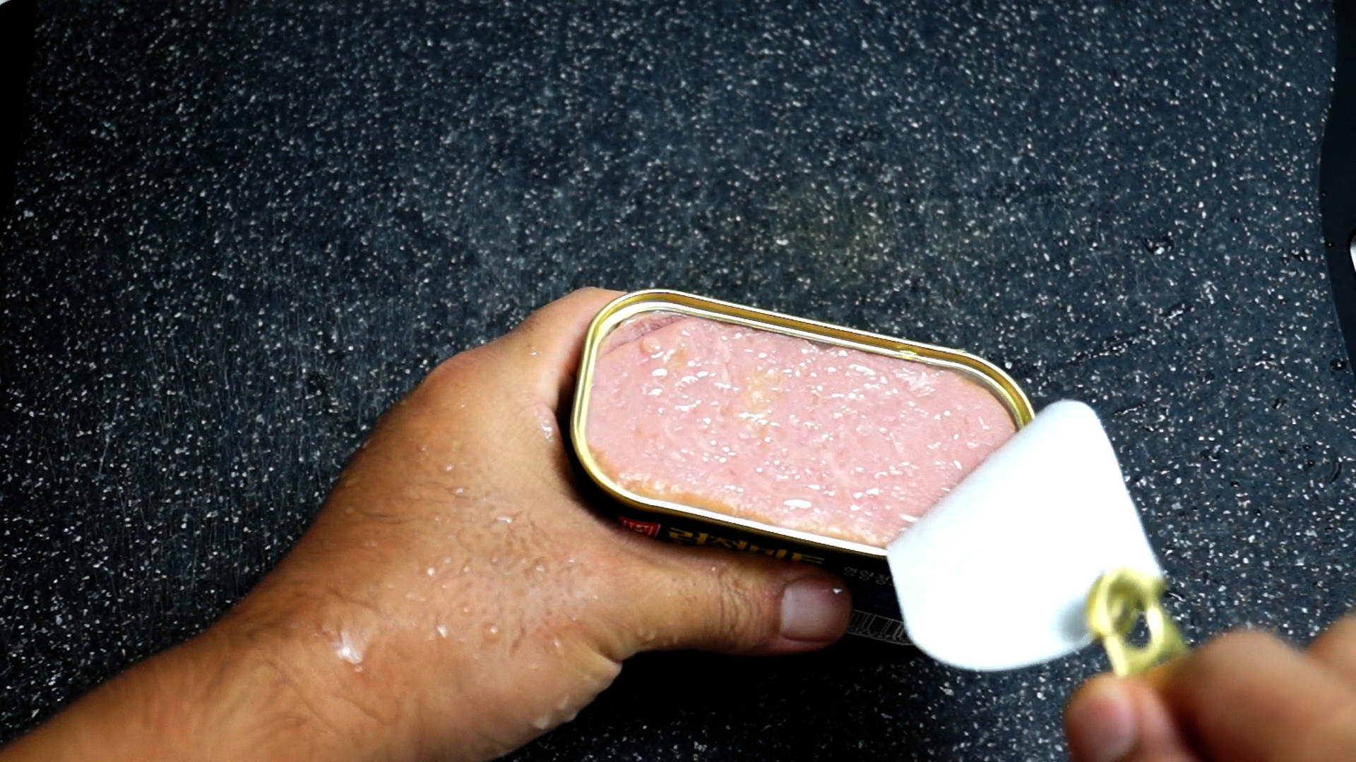 3. 통조림햄 뺄대 이렇게 모서리를 세워 강하게 탁탁탁 3~4번 친 다음 흔들어 보면 잘 빠져요~ 빼는 법이 궁금하시면 영상속에 있으니 참고하세요.