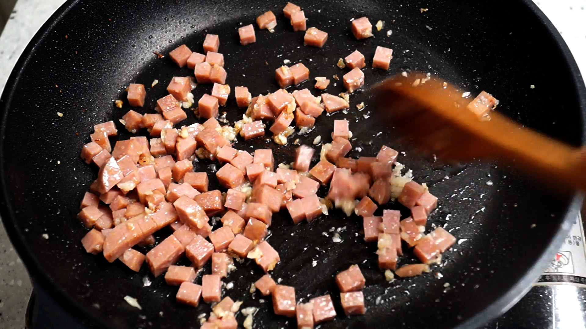 9. 마늘 익는향이 솔솔 올라오면 햄을 넣고 불을 중불로 올리고 1분 정도 볶아주세요.