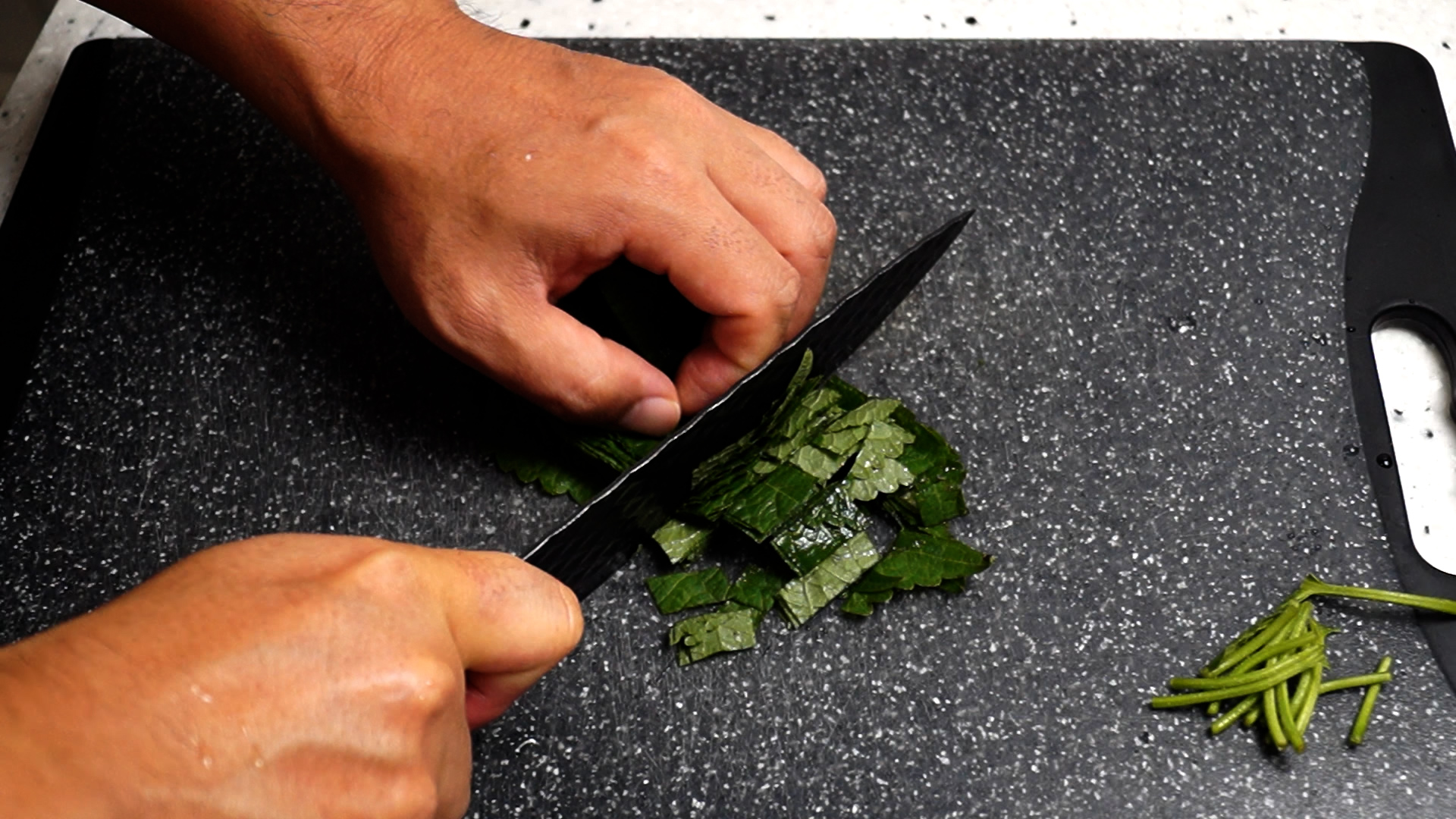 5. 깻잎 1단 14~16장 무게로 23~25g 정도 되는 양을 물에 10분 정도 불린후 씻어서 2cm 정도 크기로 썰어주세요.