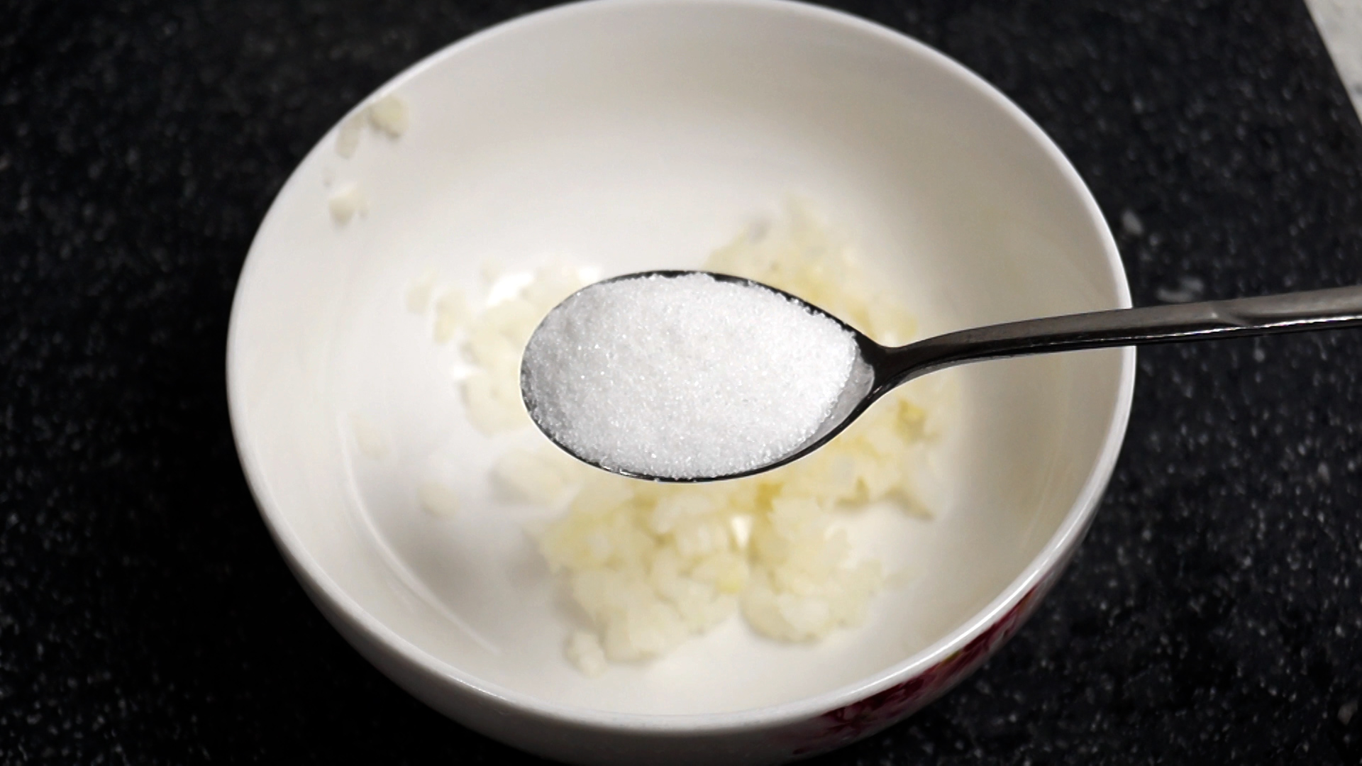 2. 다진 양파를 볼에넣고 설탕을 깍아서 넣어주세요. 단맛은 양념 완성후 기호에 맞게 수정해주세요.
