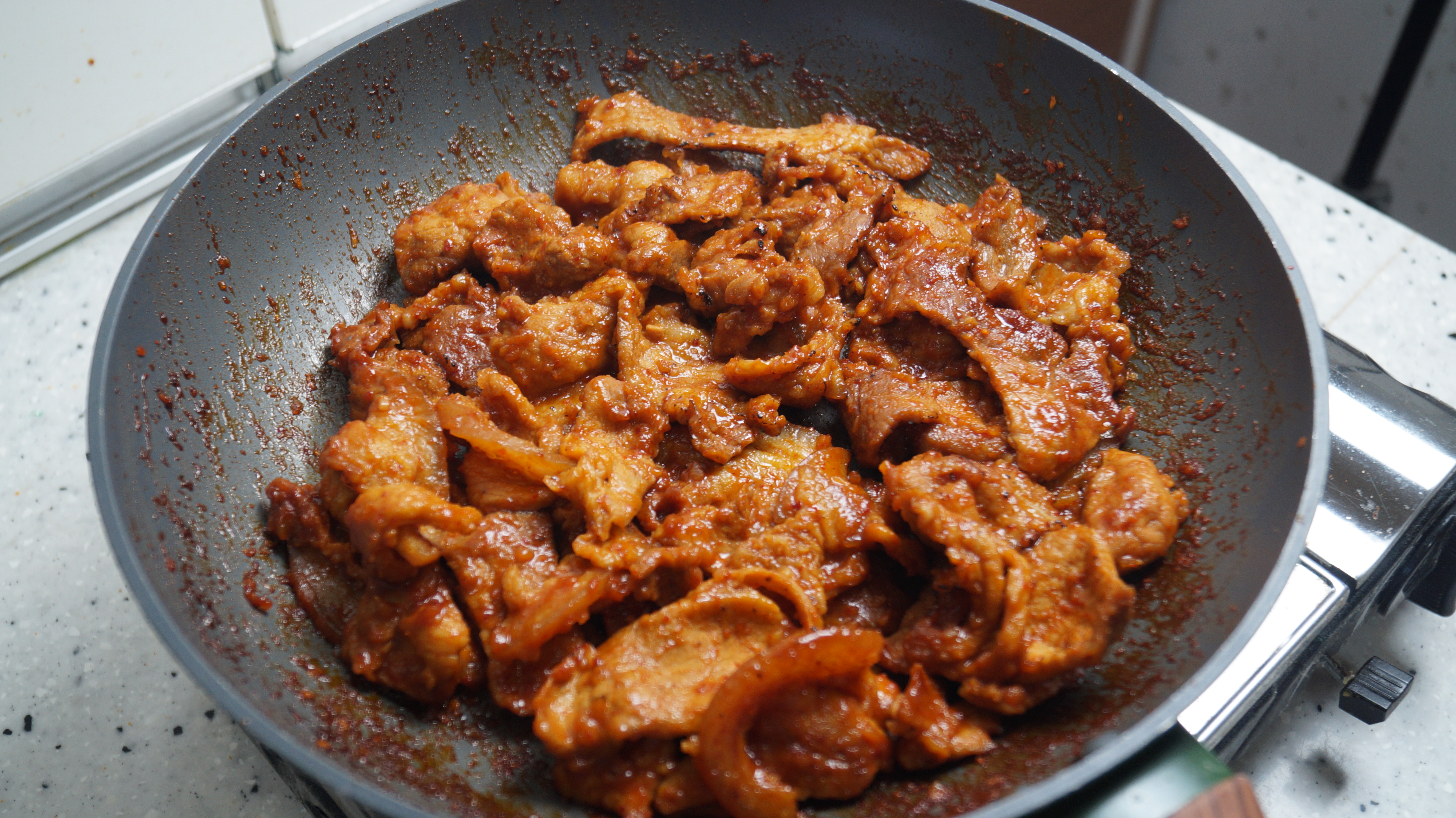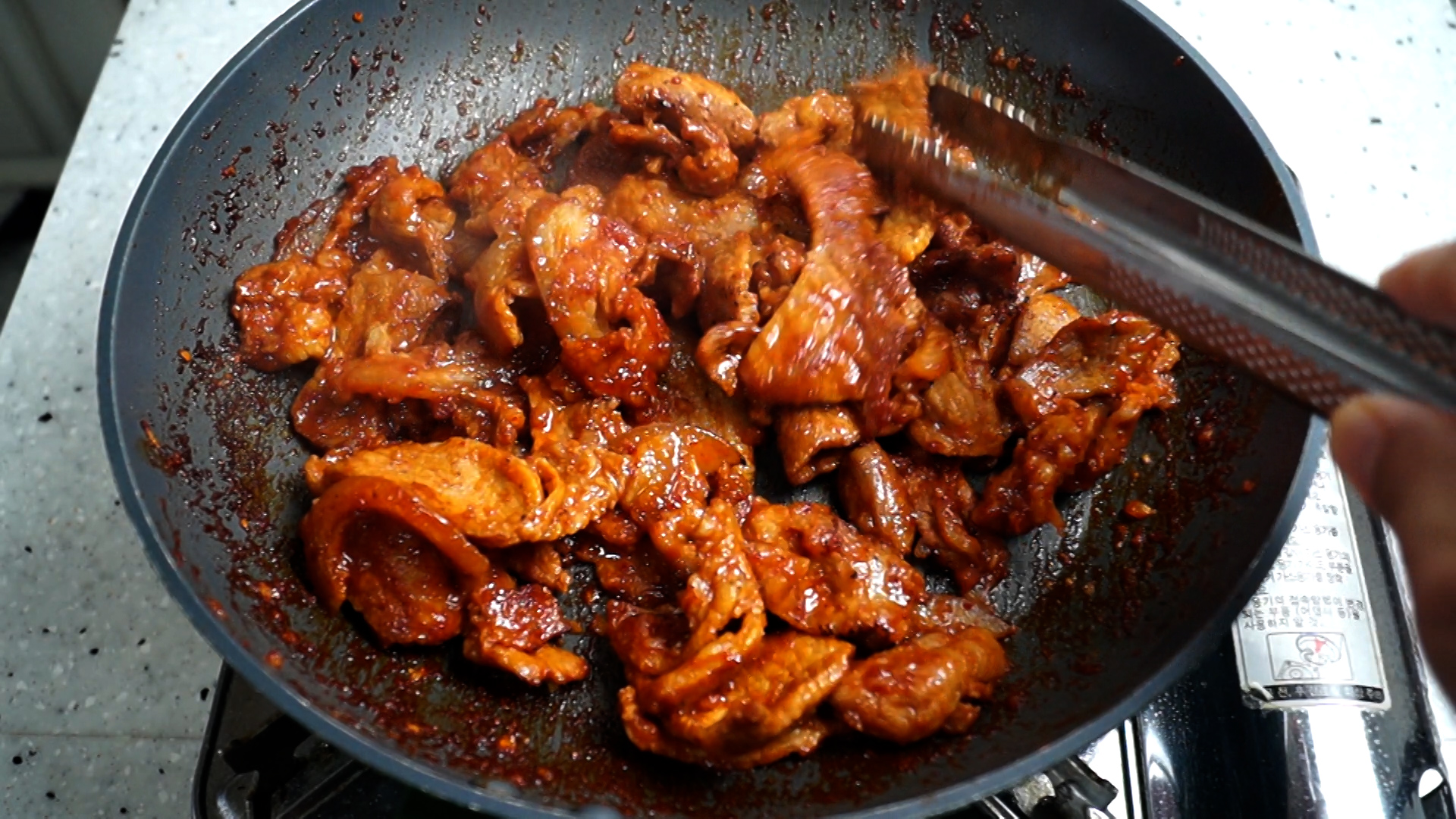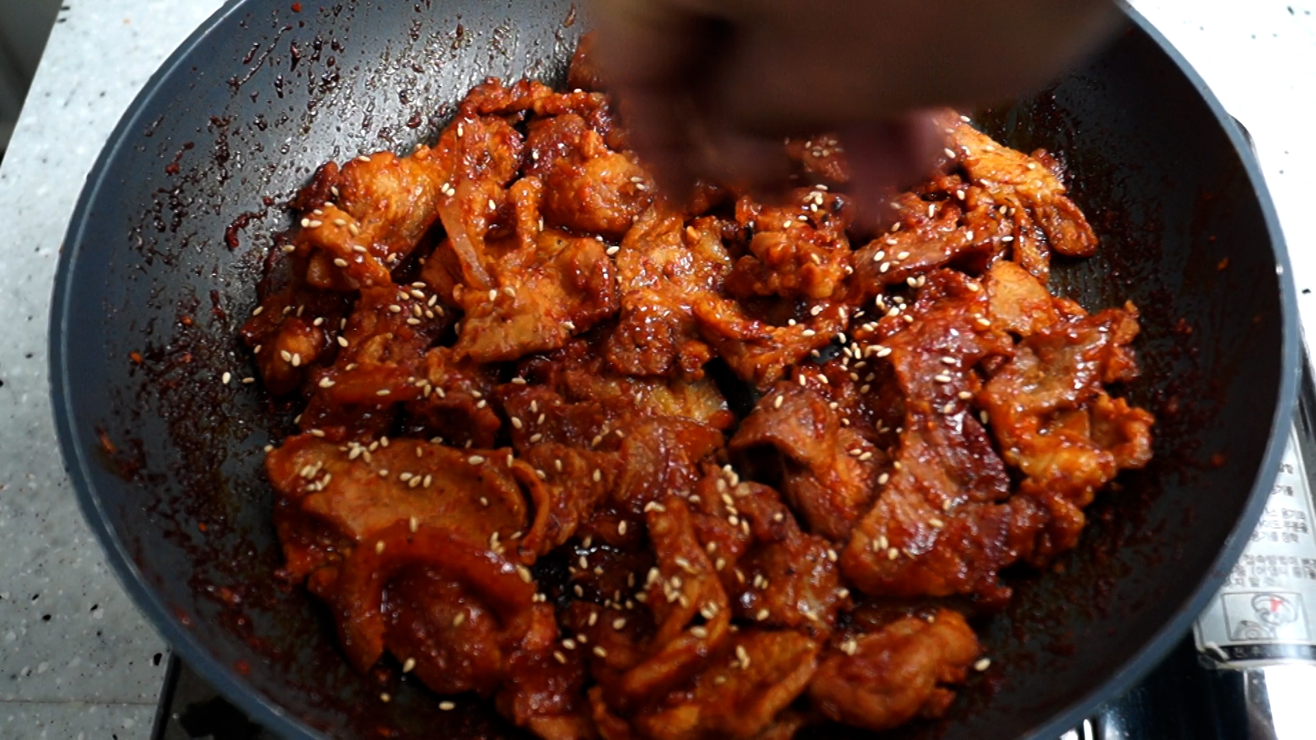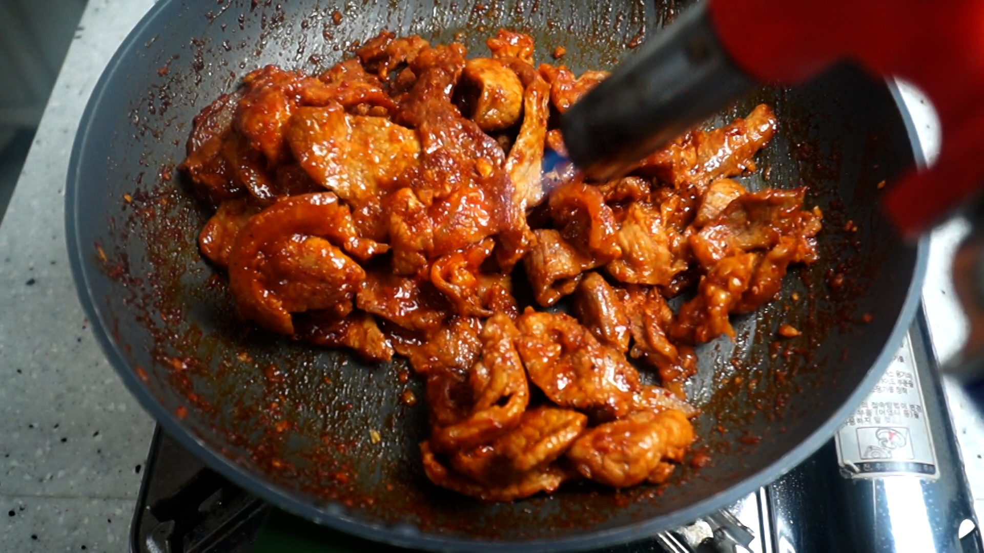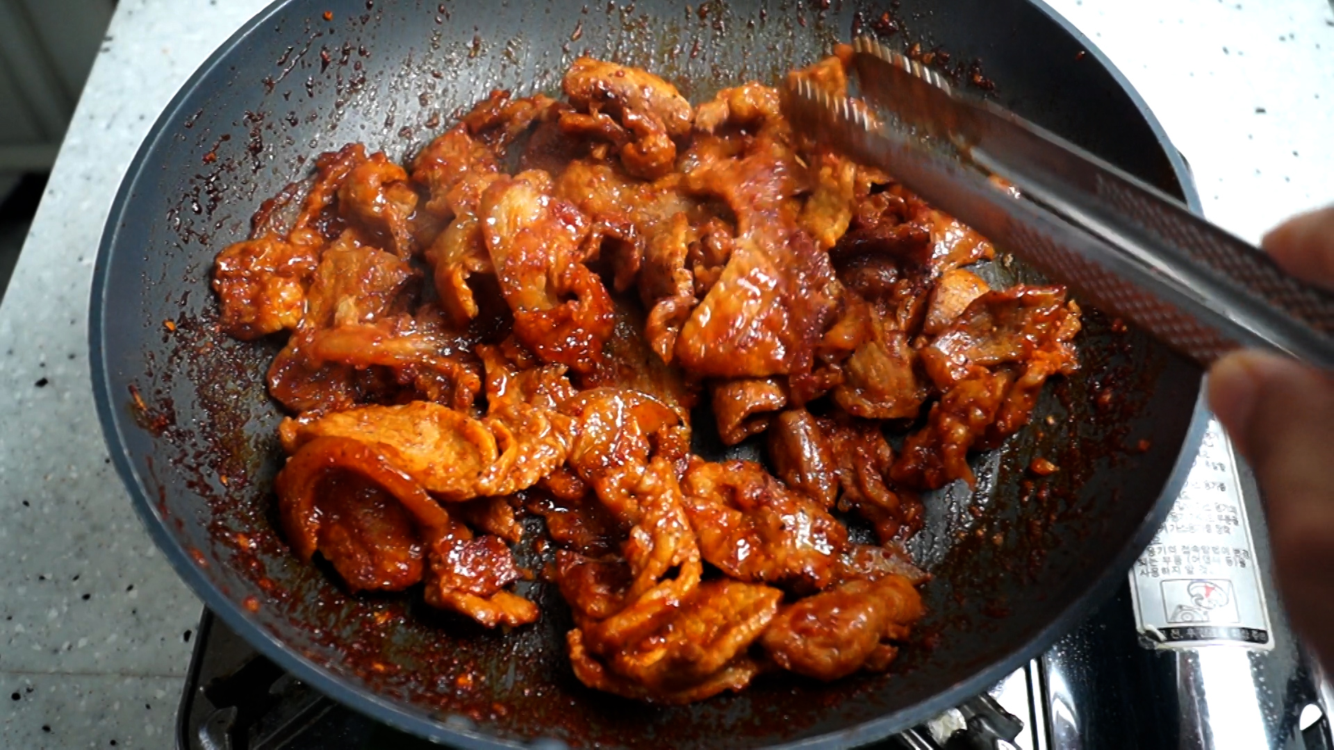 18. 양념이 타지않게 골고루 섞어 주면서 대략 3~4분 볶아고기를 완전히 익혀주세요. 고기가 너무 두꺼우면 고기가 익기전에 양념이 탈수 있으니 고기 두께에 주의하세요.