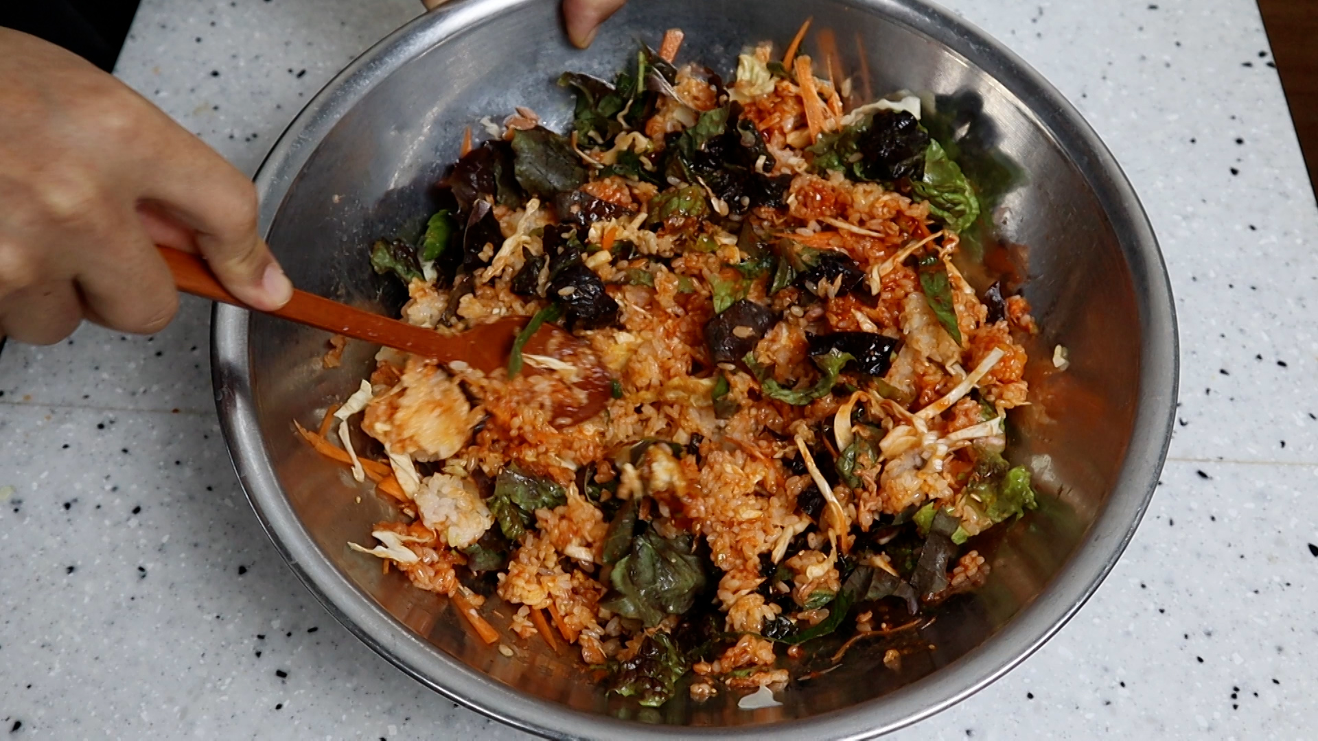 7. 야채 양은 기호에 따라 늘이고 줄이셔도 되고 제 기준 야채를 섞어서 크게 1주먹 쥐면 1인분 정도 비비기 좋은 양입니다.