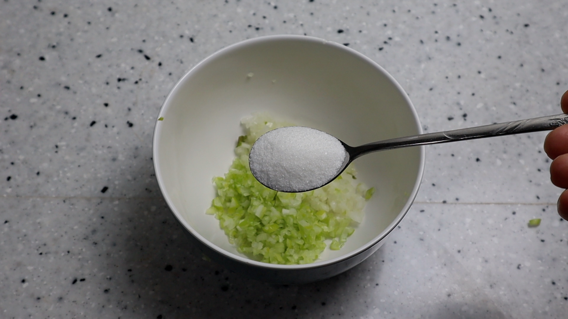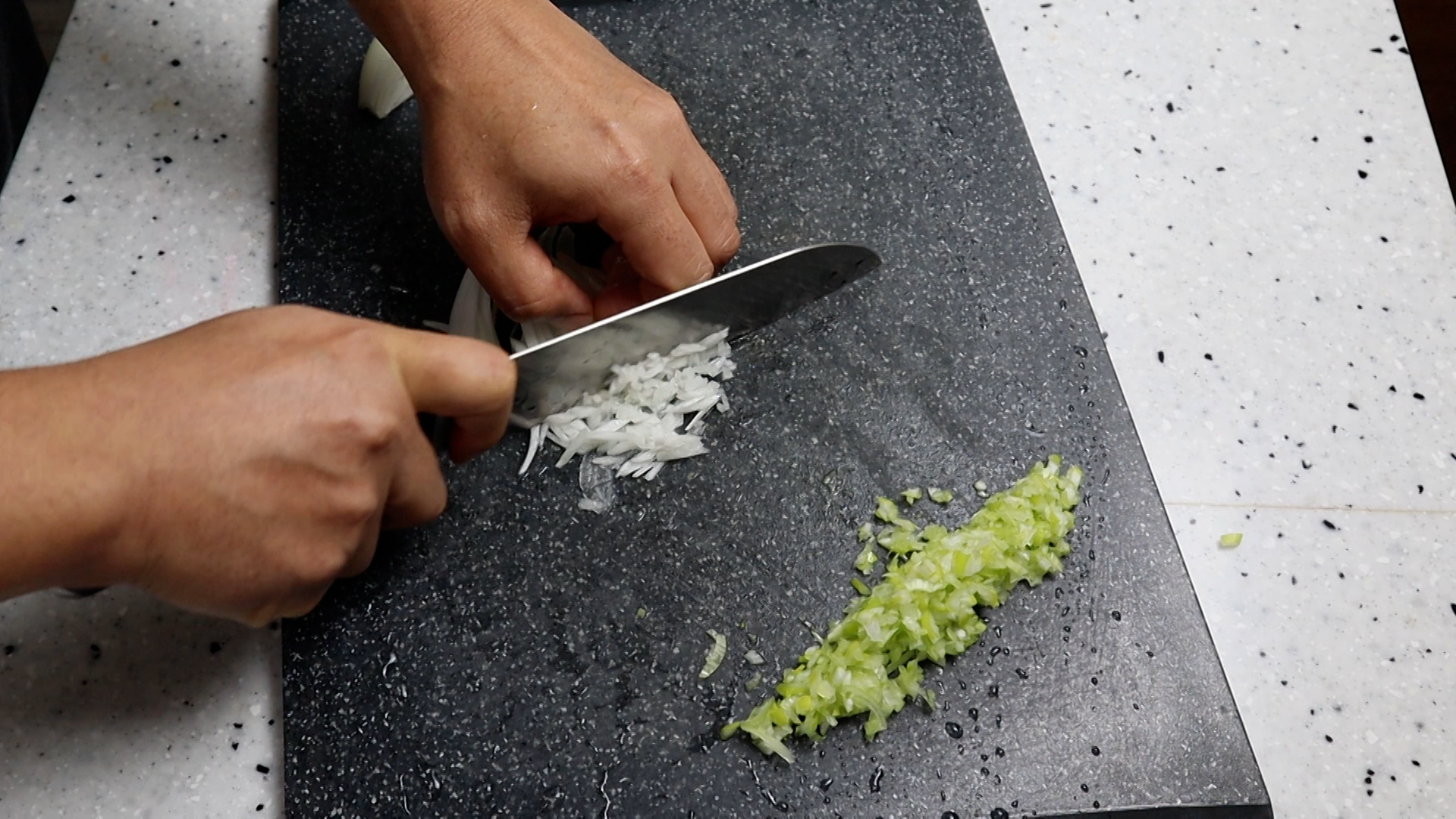 2. 양파도 잘게잘게 다져주세요. 양파는 다져서 크게 쌓아 고봉으로 2큰술 준비해주세요.