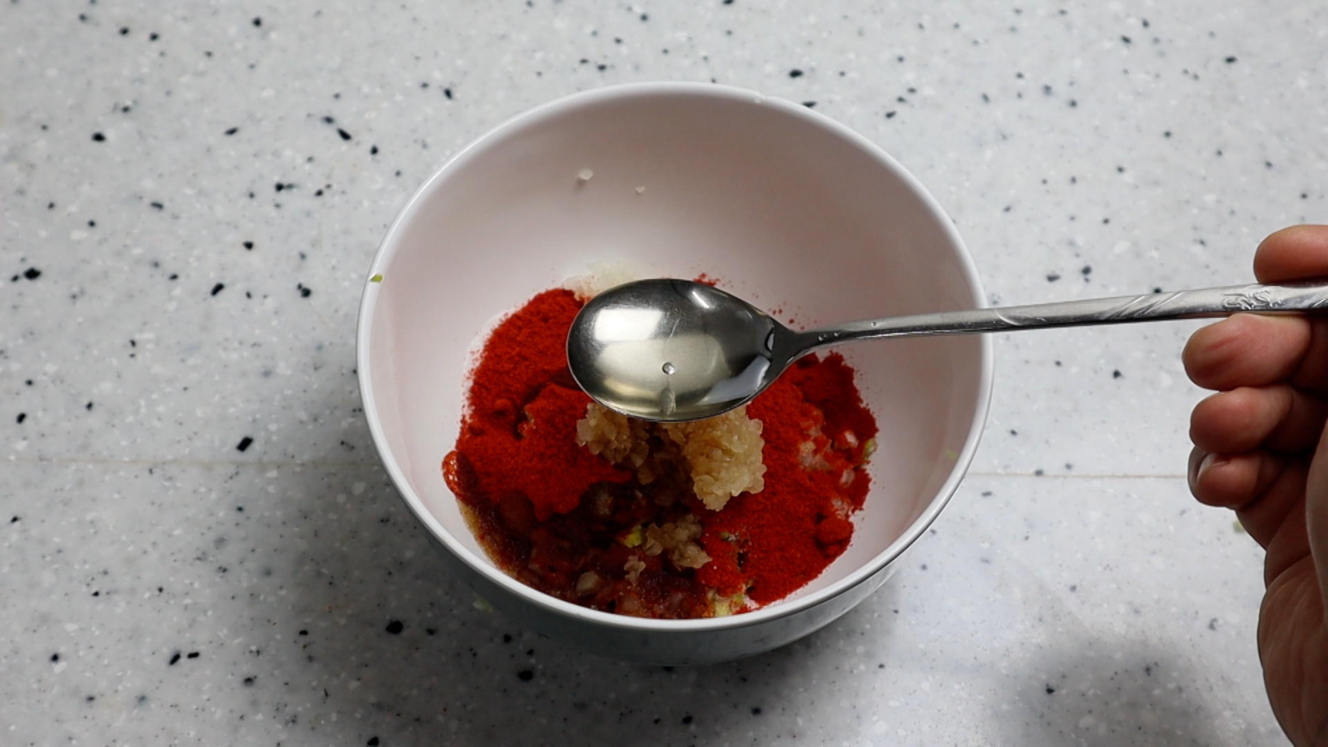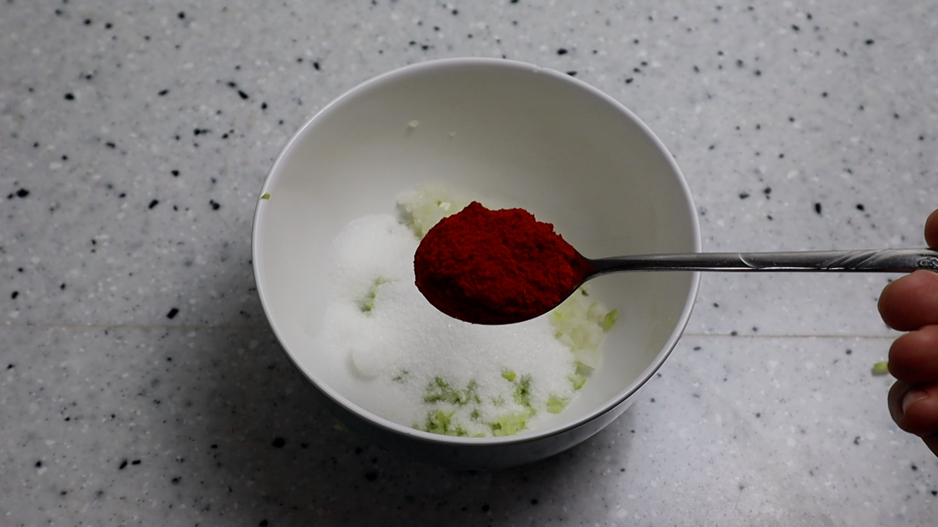 10. 고운고춧가루를 넣어주세요. 일반 고춧가루도 괜찮지만 고운 고춧가루가 가루 거슬거림이 없어 비빔밥이 좀더 깔끔하답니다.