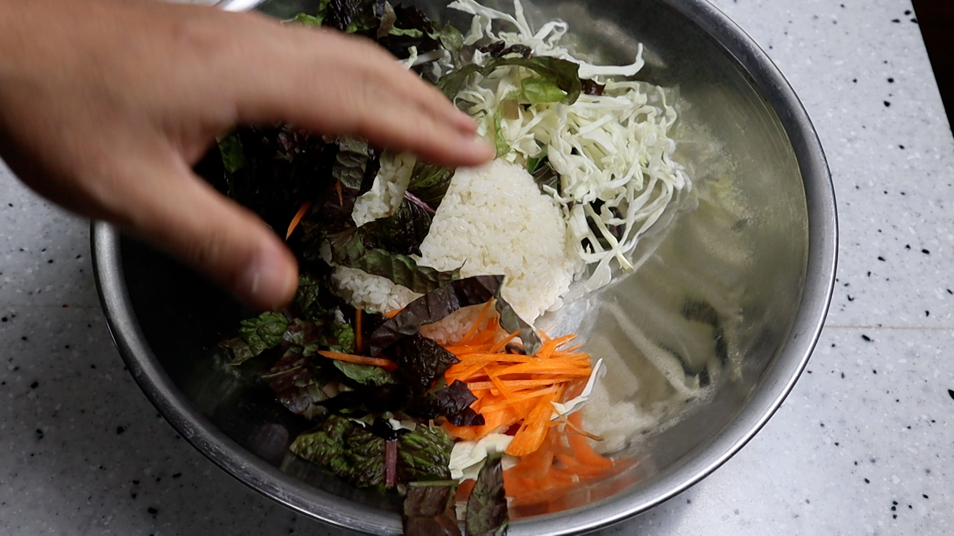 21. 볼에 2인분기준 밥 2공기와 야채를 크게 2주먹 넣어주세요.