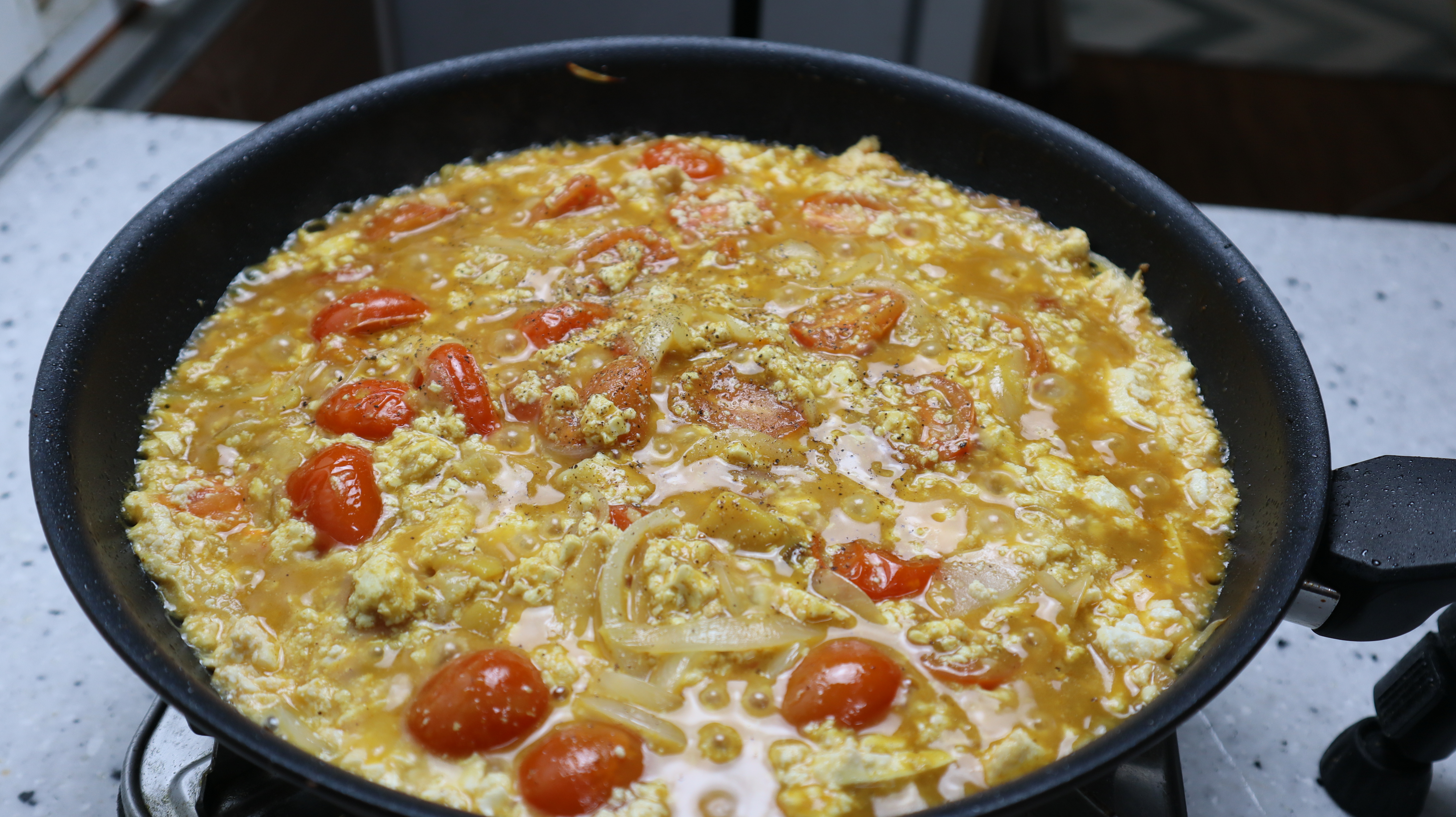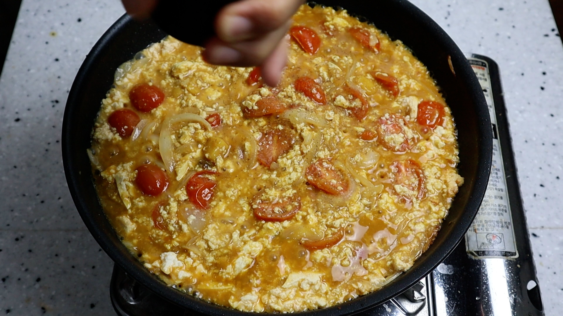 12. 1분 정도를 더 볶아 주면 토마토 껍질이 쪼글쪼글 해질거에요.