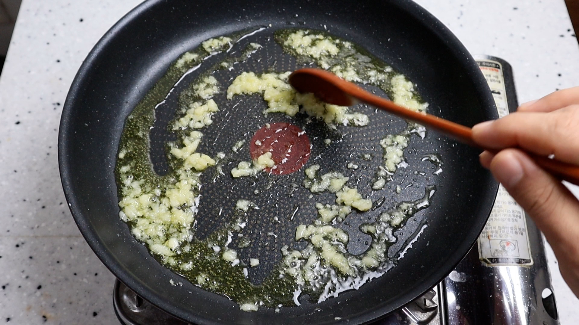 7. 약불에 마늘이 자글거리면 1분 30초 정도 볶아주세요.