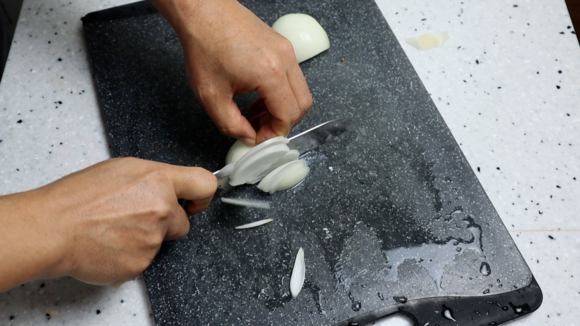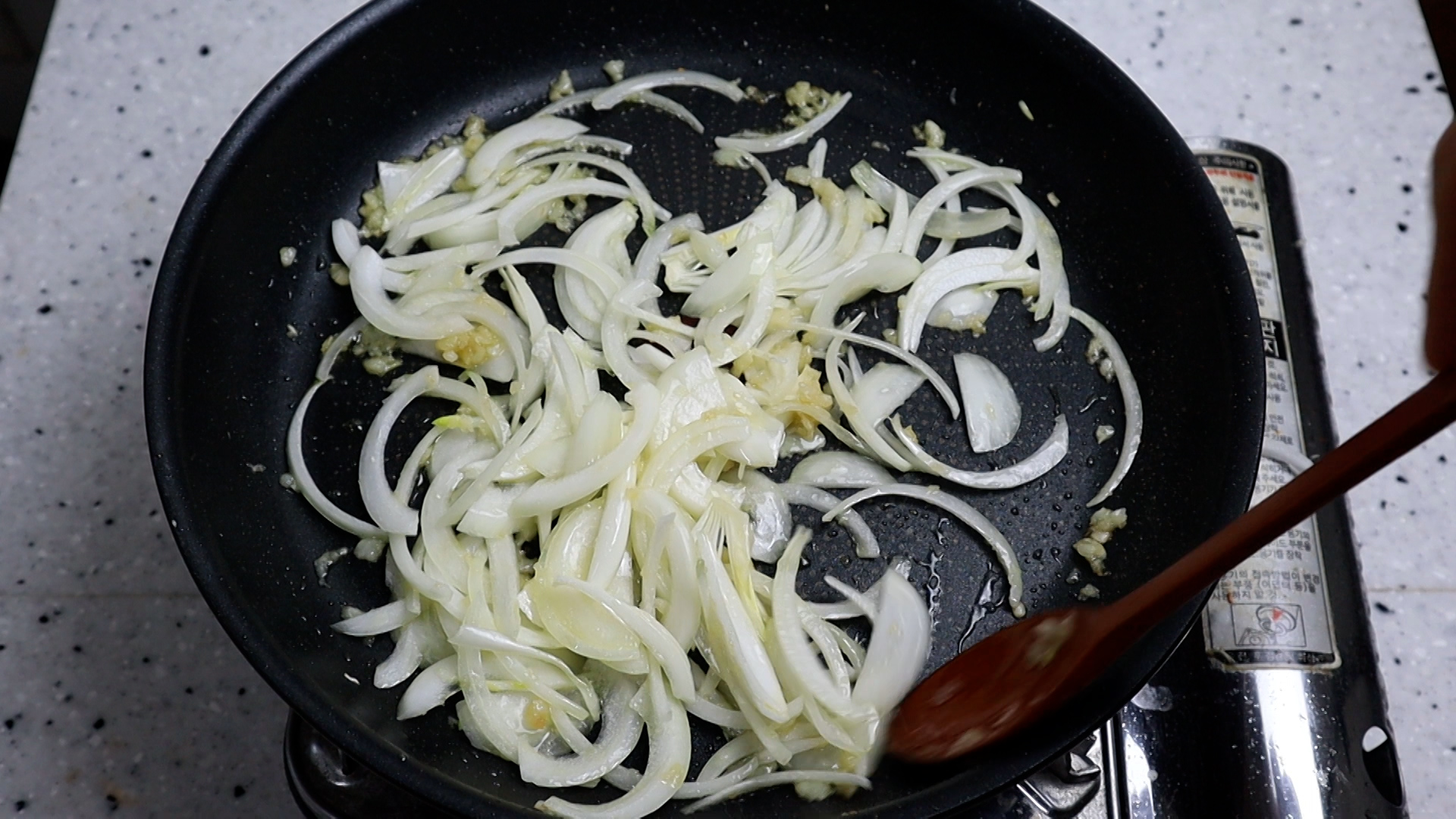 8. 양파를 넣고 불을 강불로 바꾸고 1분간 볶아 양파 숨을 살짝 죽여주세요.