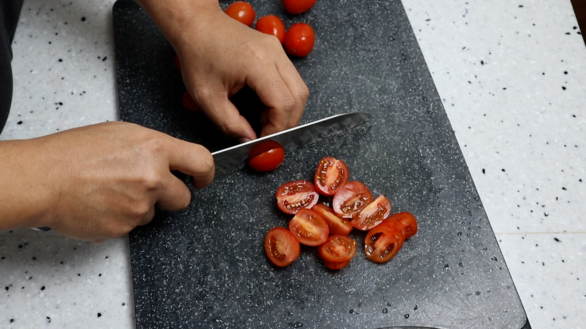 2. 토마토를 너무 잘게 썰지 말고 반으로 잘라주세요. 방울토마토 대신에 일반 토마토 1개를 준비하셔도 좋습니다.