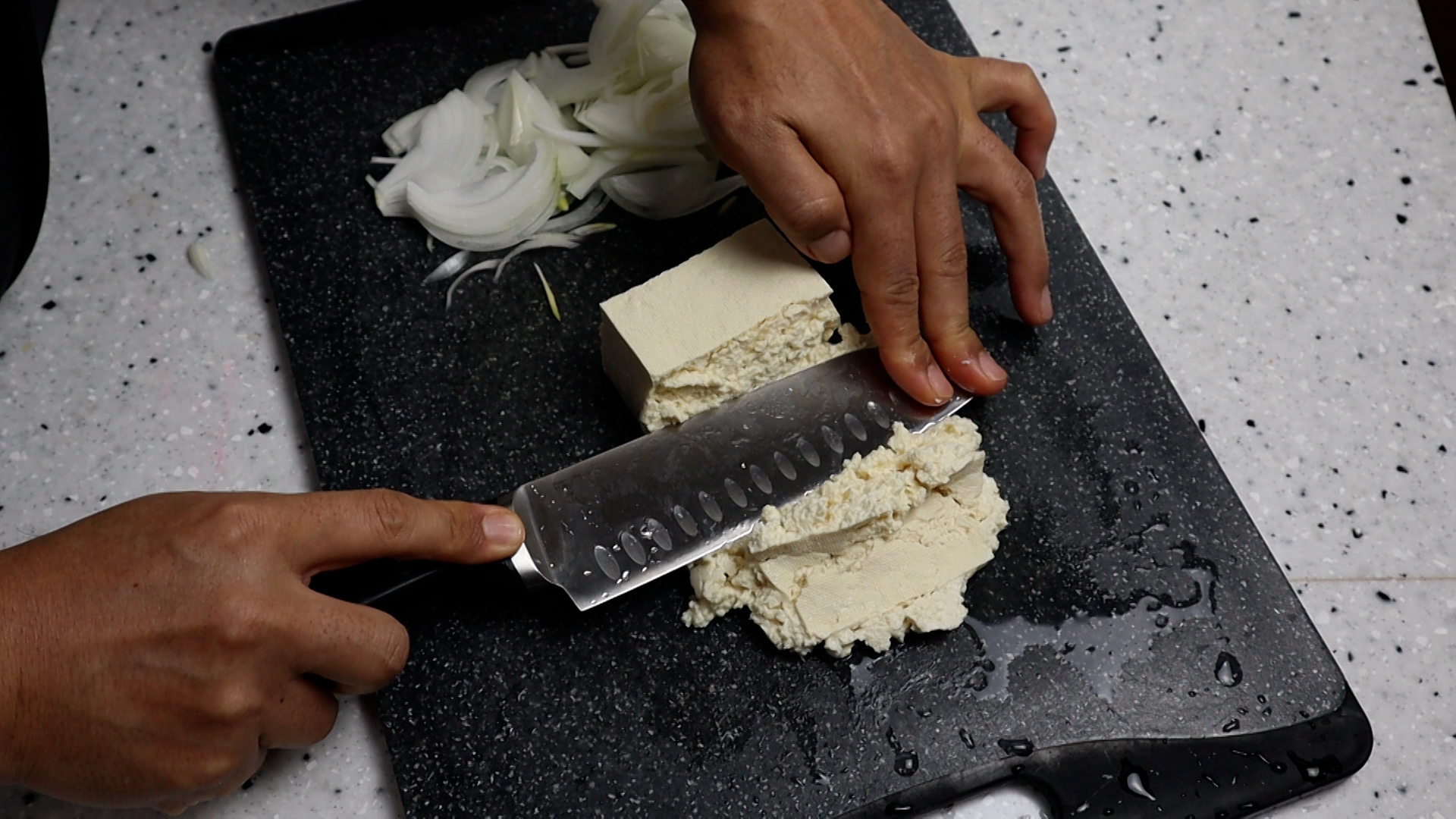 4. 두부는 수분이 적은 단단한 부침용으로 300g 을 으깨준 다음에 잘게잘게 다져주세요.