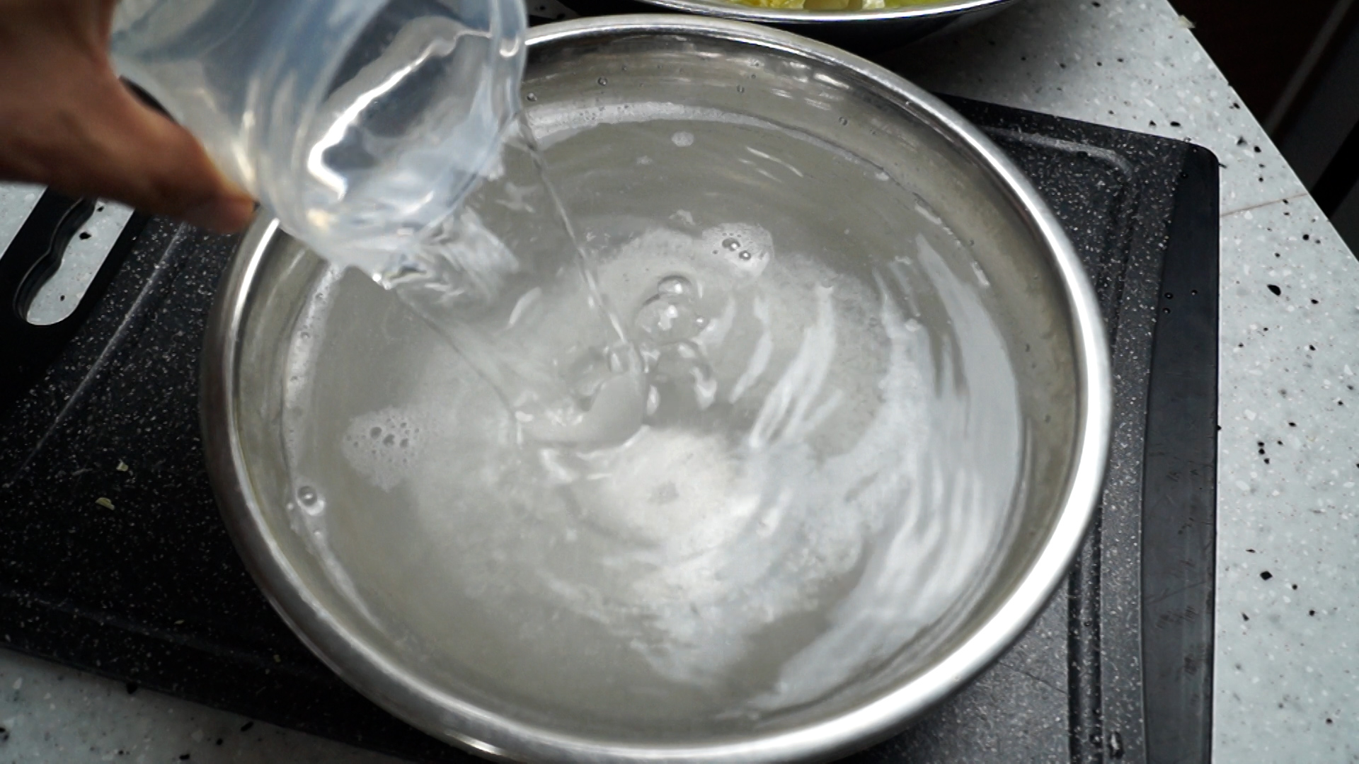 3. 볼에 배추절이기 굵은소금과 물을 넣고 소금을 완전히 녹여주세요.
