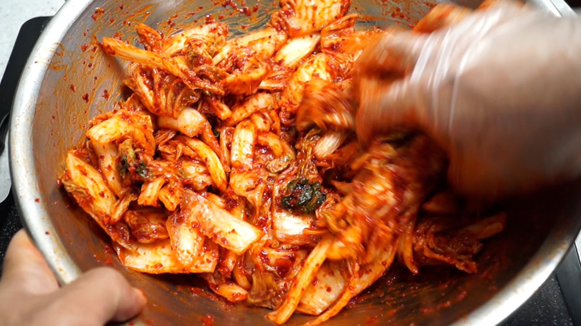16. 물기뺀 배추에 양념을 넣고 골고루 섞어주세요. 우선 양념을 80~90% 넣어 버무린 다음 색감 보고 나머지 더 넣으시면 좋고 혹시 양념이 너무 많거나 간이 쎄면 무를 얇게 채썰어 한움큼 넣어주시면 됩니다~