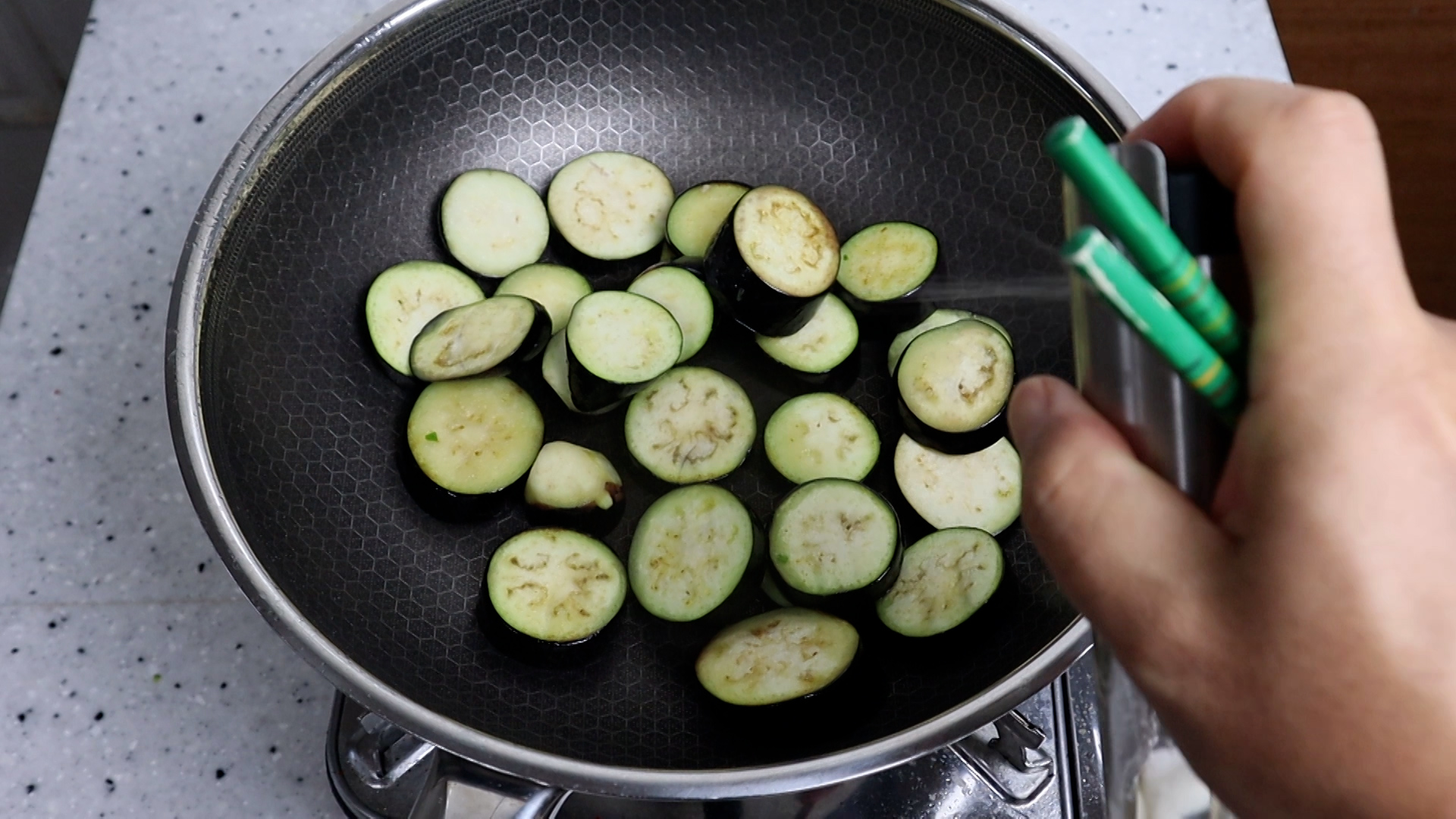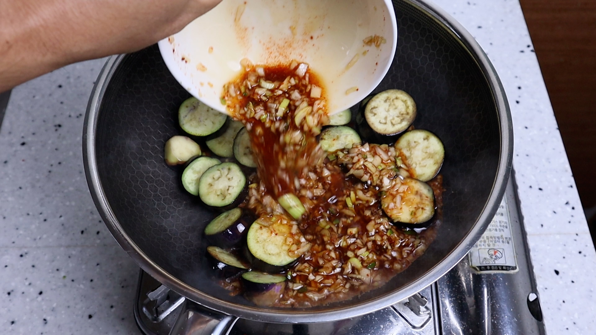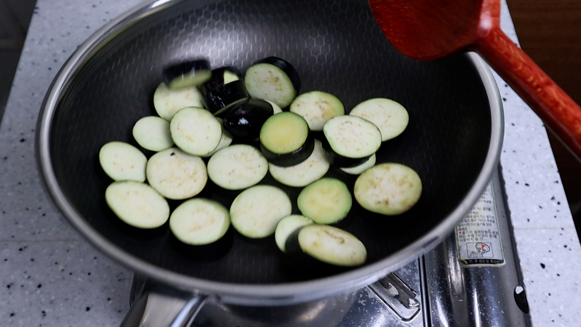 18. 가지가 기름을 너무 많이 먹어 팬이 말랐다면 기름을 적당히 더 뿌려주세요.