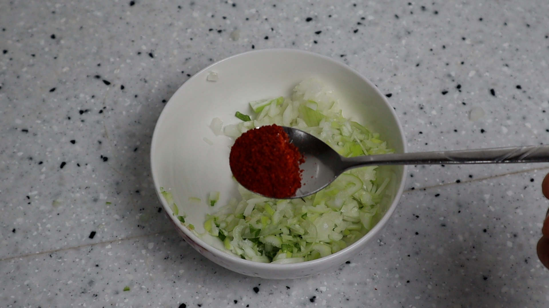 6. 대파, 땡초, 양파를 볼에 넣고 고춧가루를 넣어주세요.