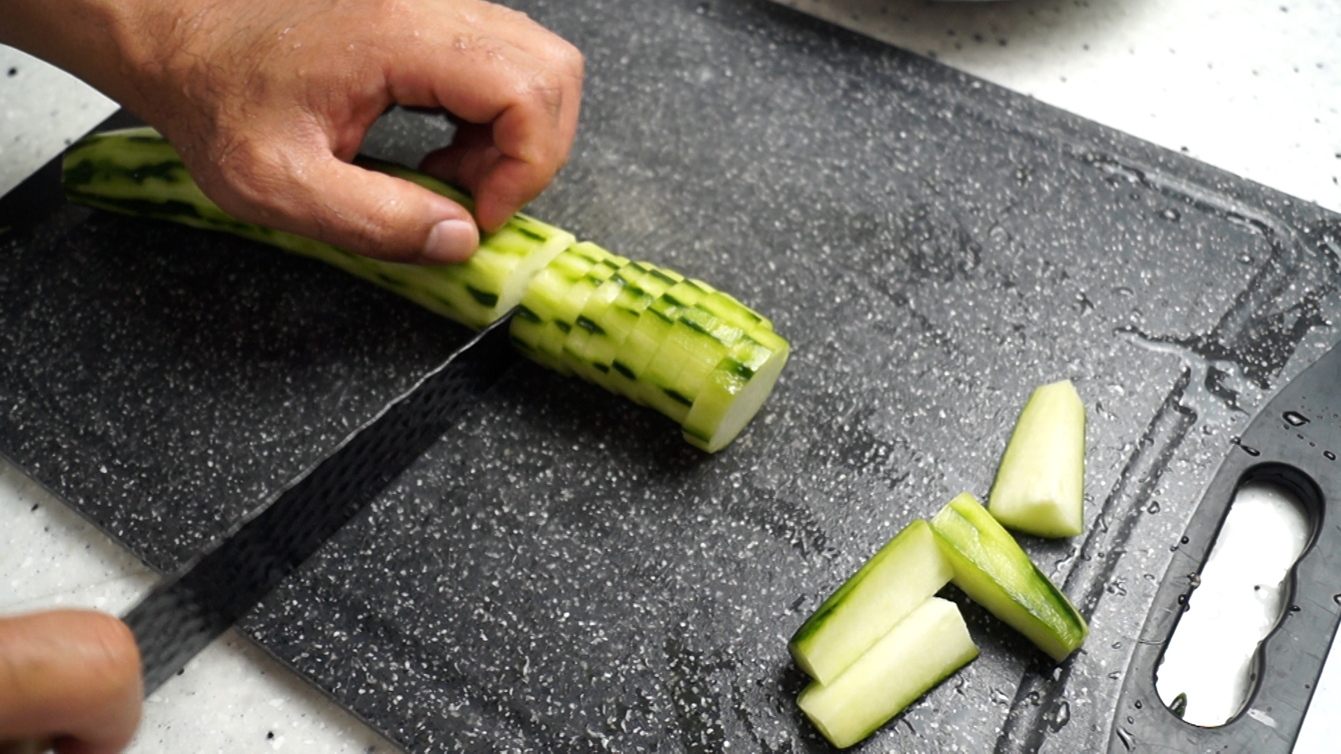 4. 오이는 1cm 정도로 동글동글 써셔도 되고 사선으로 비껴썰어 길쭉하게 썰어도 되고 기호에 맞게 썰어주세요.