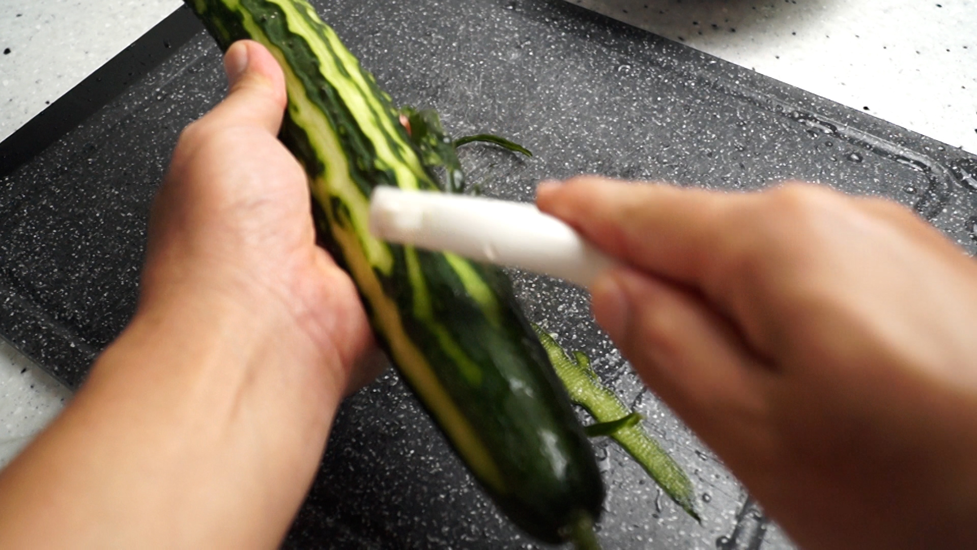3. 오이는 통통하고 긴거 1개 얇고 긴거는 2개를 준비해서 껍질을 벗기거나 소금으로 깨끗히 문질러 준비하세요.