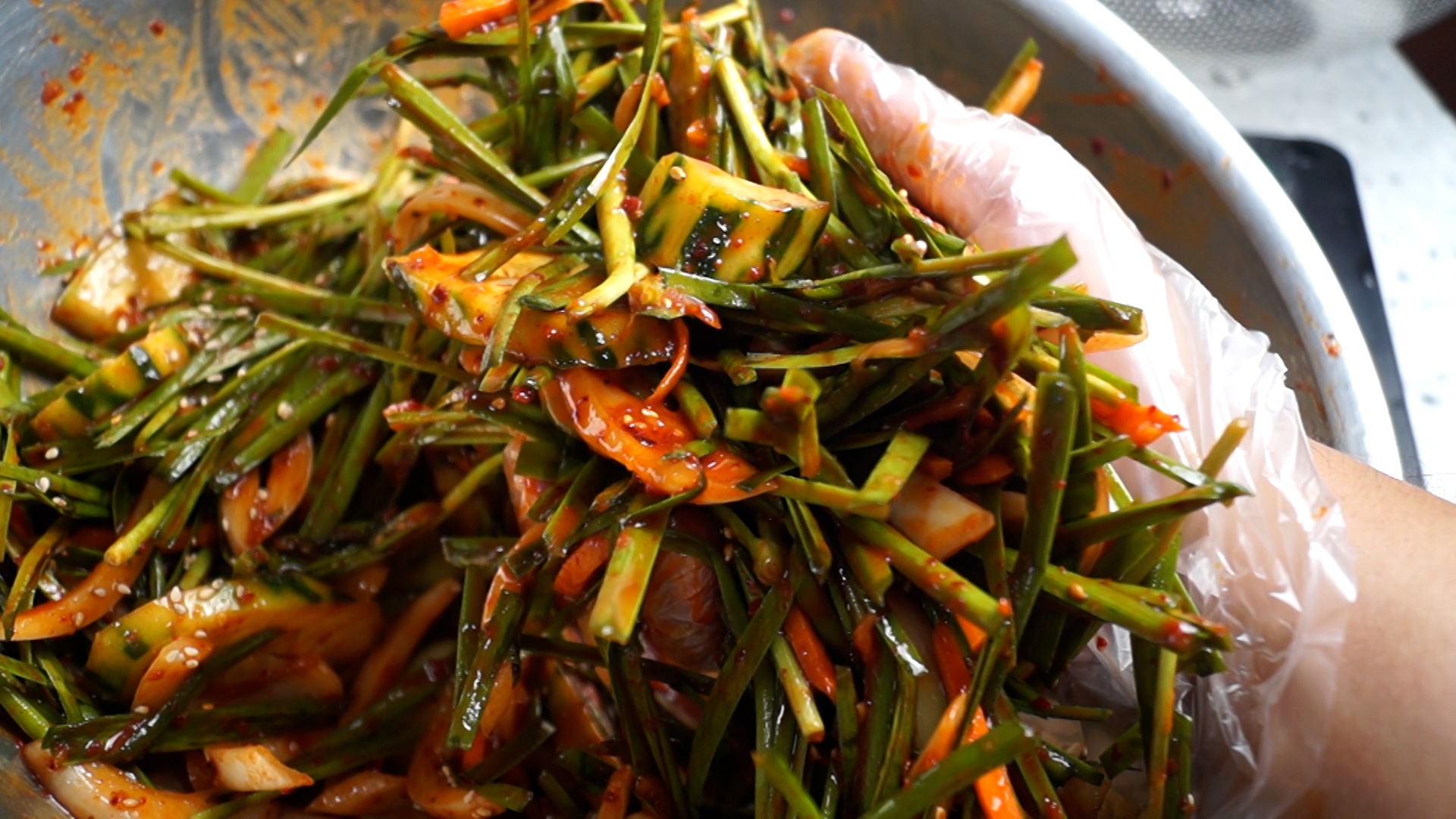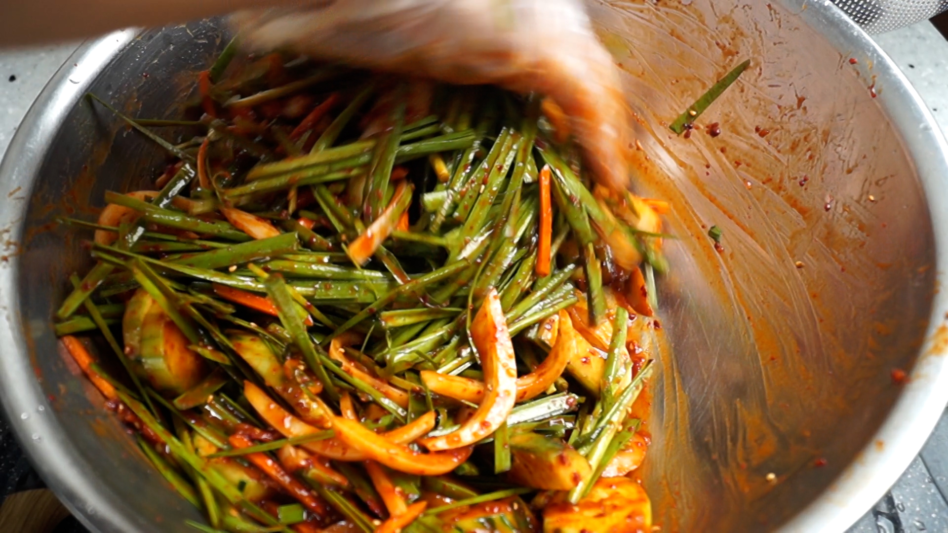 20. 활력보강에 좋다고 소문난 부추를 넣고 너무 힘주지 말고 살랑살랑 무쳐주세요.