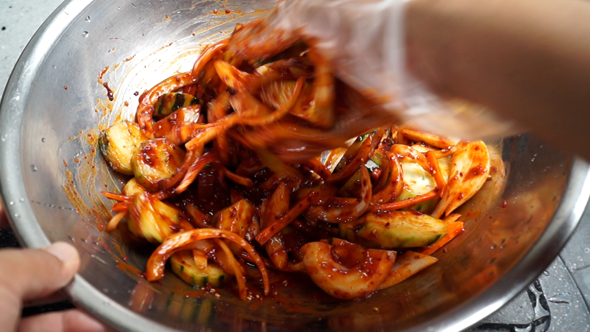 19. 오이와 당근 양파를 먼저 넣고 슬렁슬렁 무쳐주세요.
