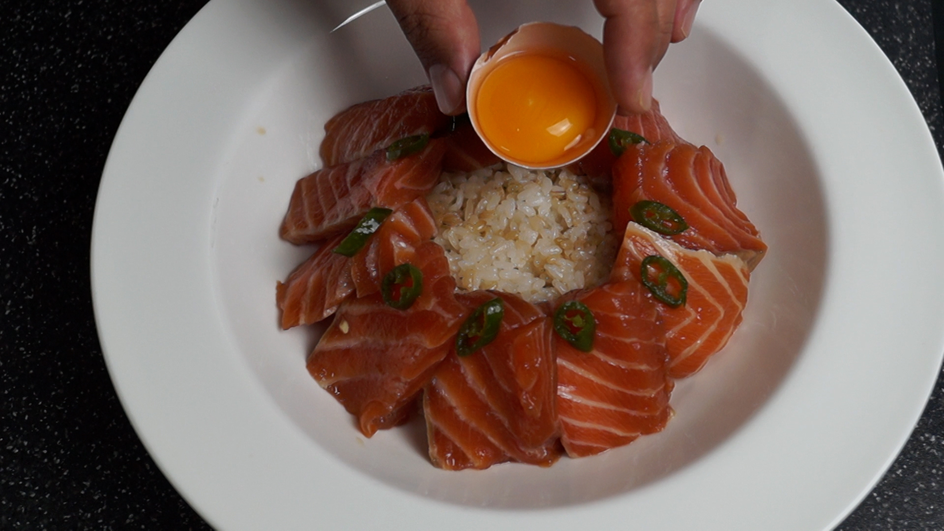 17. 신선한 계란 노른자 1알 올려서 간장양념과 밥과 함께 비빈 다음 연어랑 드셔보세요. 정말 맛있습니다!