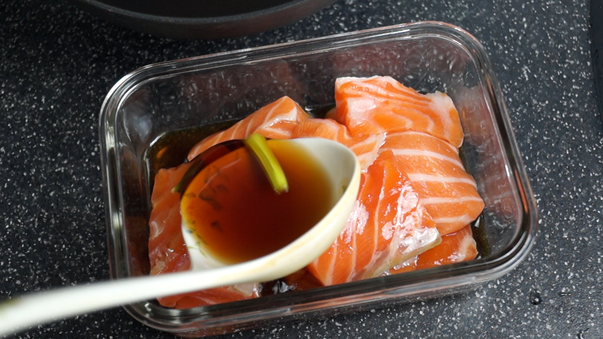 10. 횟감 연어 300g 을 1cm 두께로 두툼하게 썰어주세요. 연어는 400g 까지 넣어도 괜찮지만 더 들어가면 염도가 떨여져 보관 기간이 줄어드니 더 넣으셨다면 최대한 빠르게 드셔주세요.