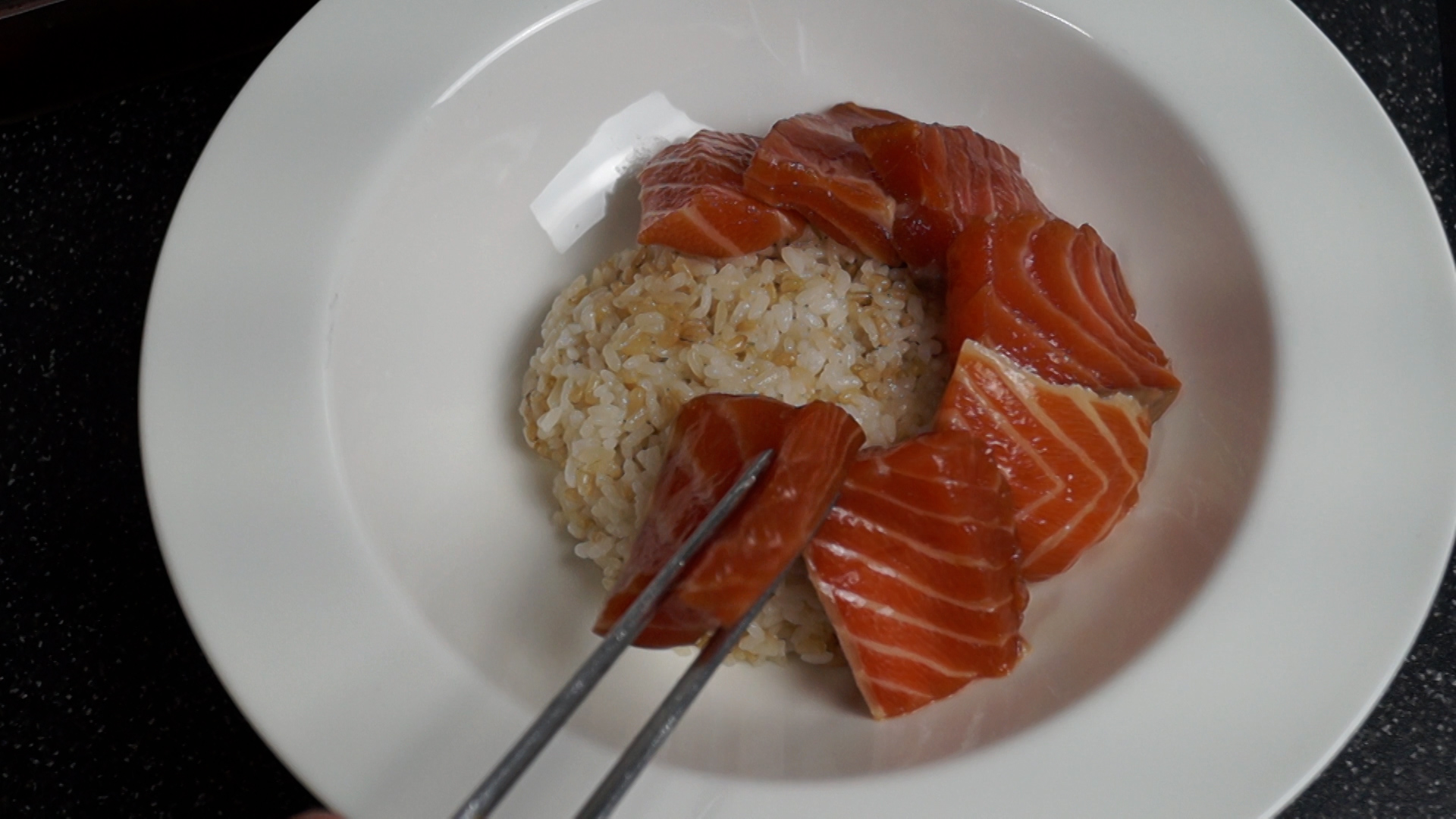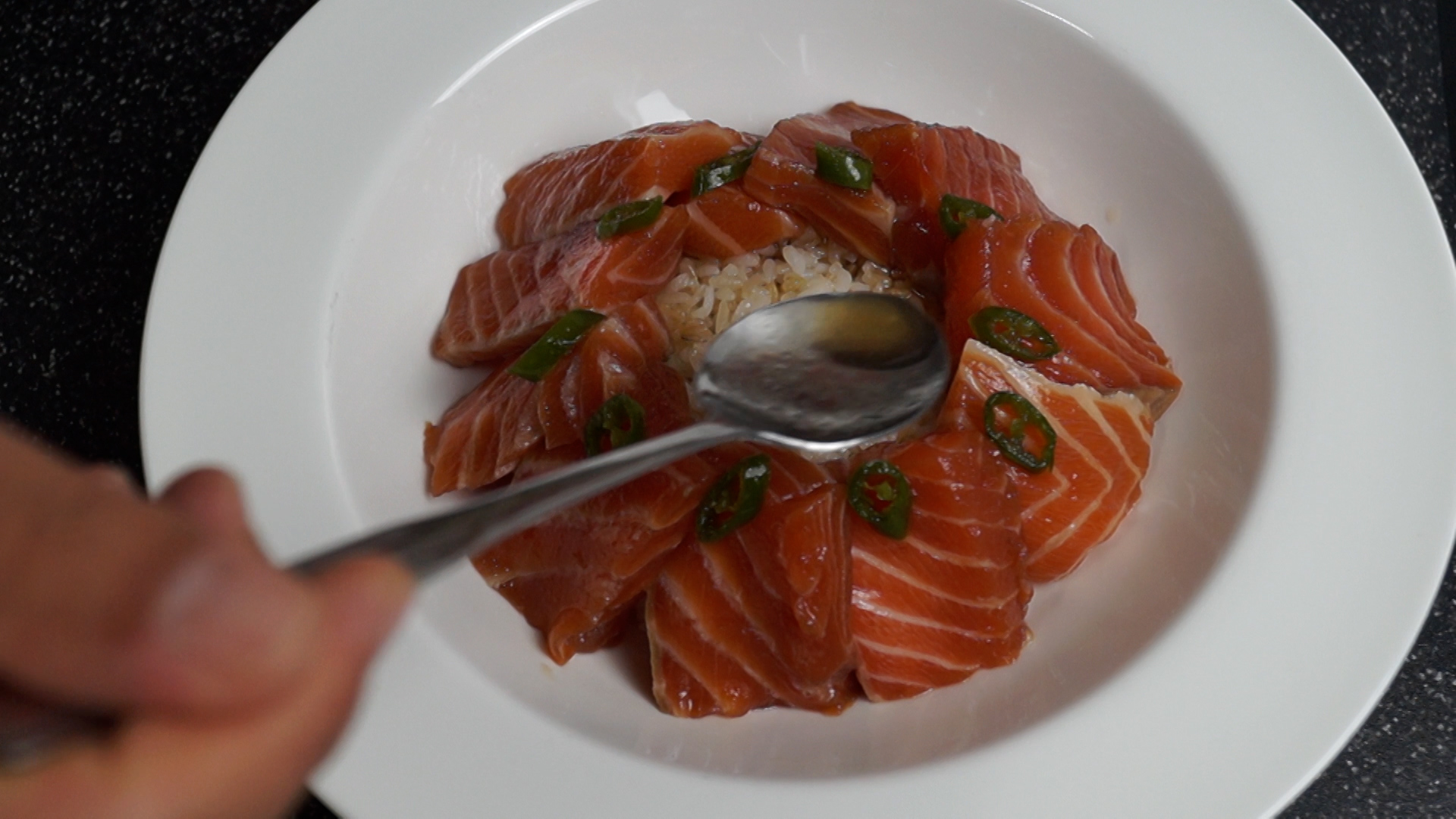 15. 절인 연어를 먹을만큼 밥에 올려주세요. 300g 이면 덮밥 2~3인분 만드는 양입니다.