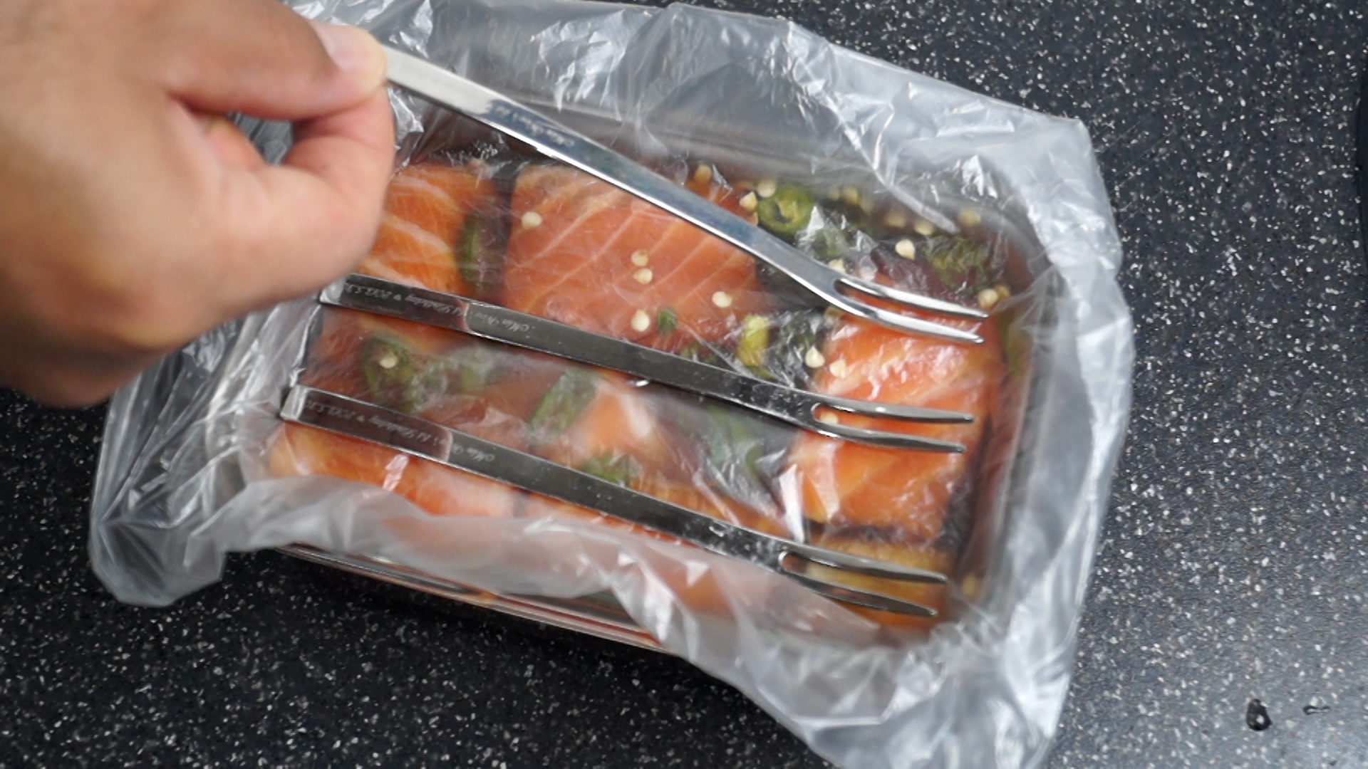 13. 위생비닐을 뒤집어서 덮어주고 그위로 포크 2~3개를 올려 공기를 빼주세요.