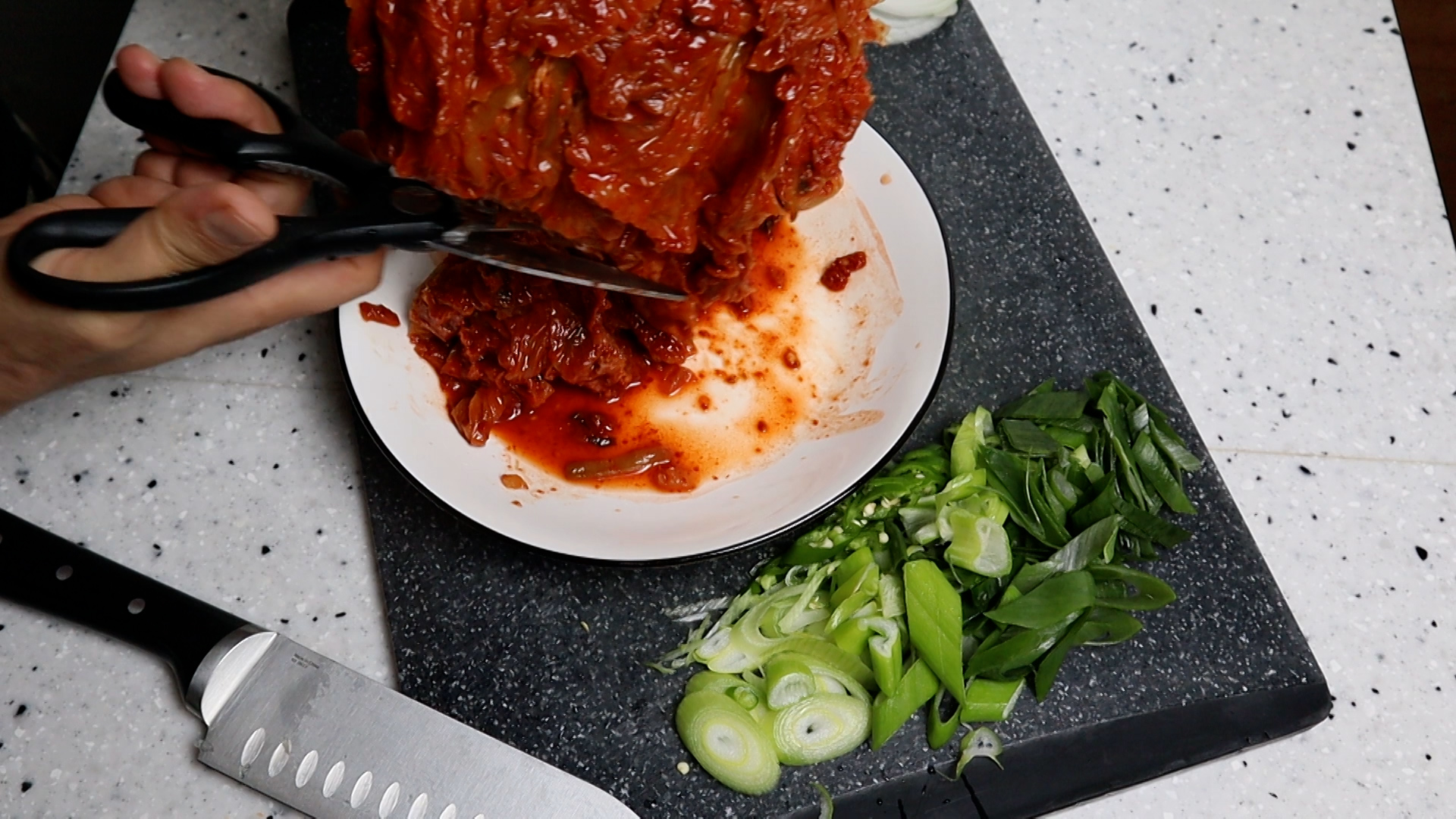 4. 묵은지 또는 적당히 익은 김치를 먹기 좋은 크기로 잘라주세요. 저는 도마 씻는게 불편해서 가위로 잘랐습니다.