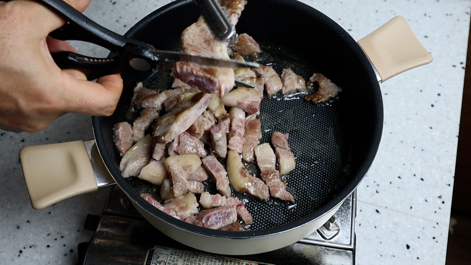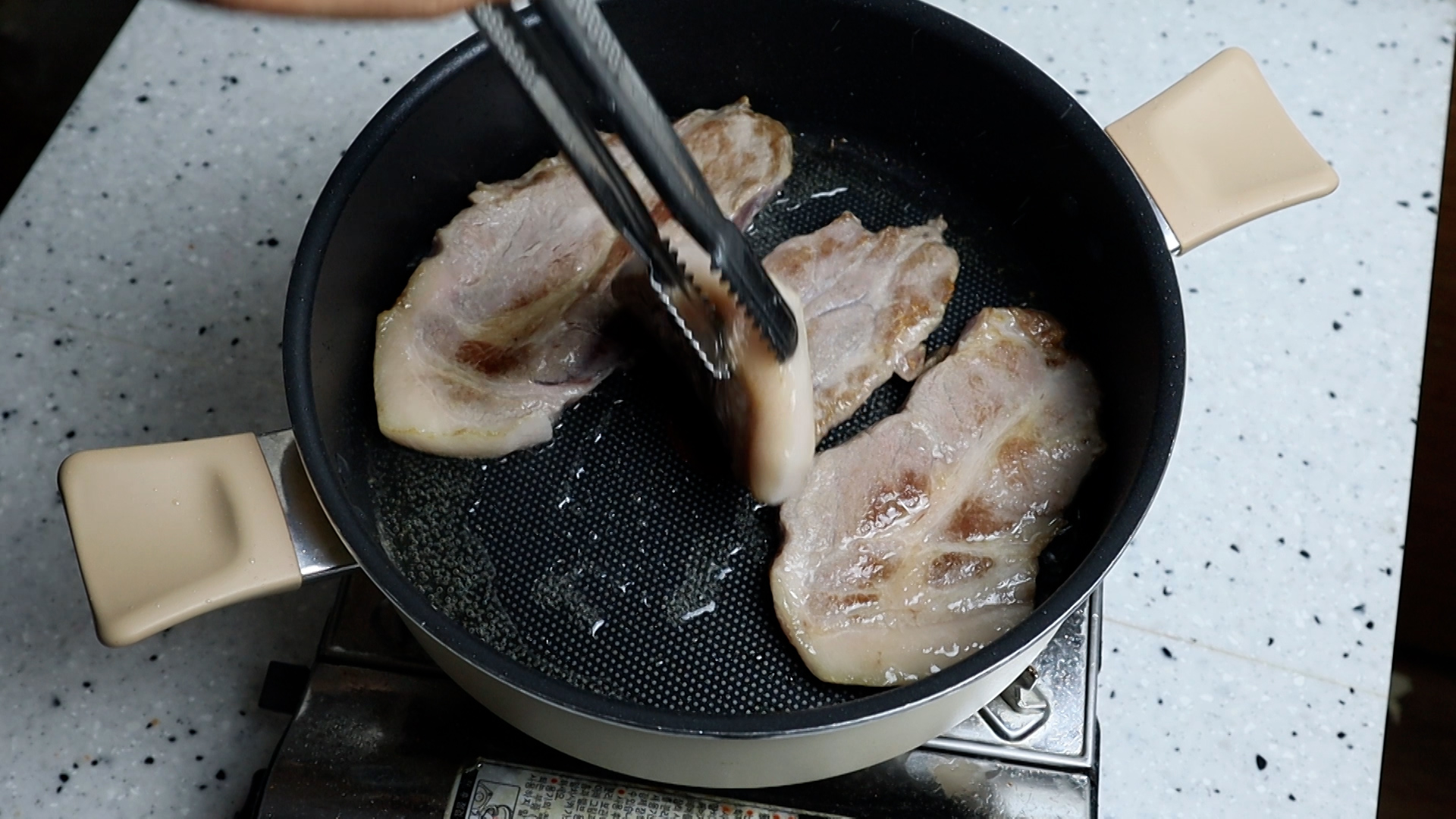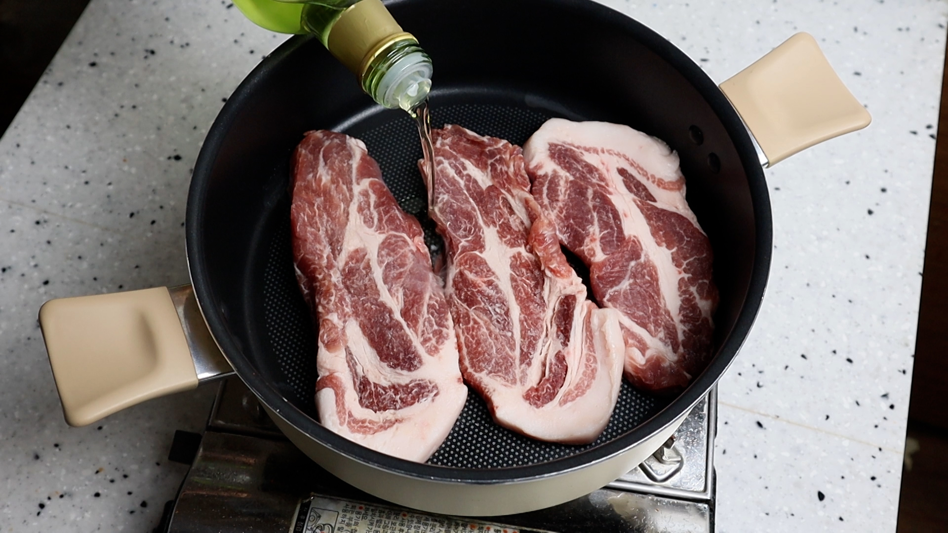 6. 코팅된 냄비나 웍을 강불로 달궈서 돼지목살을 구워주세요. 김치찌개 끓인땐 돼지목살이 제일 잘 어울리더라고요~
