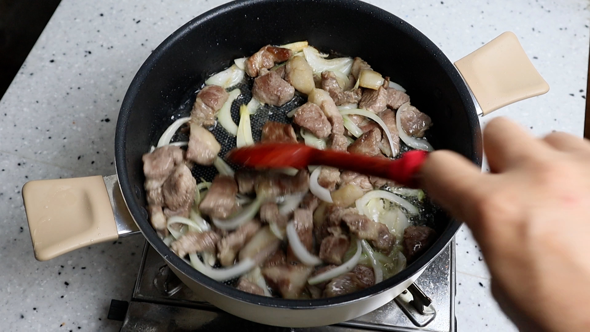 10. 양파를 넣고 양파가 숨이 살짝 죽으며 단맛이 나오게 2분정도를 볶아주세요.