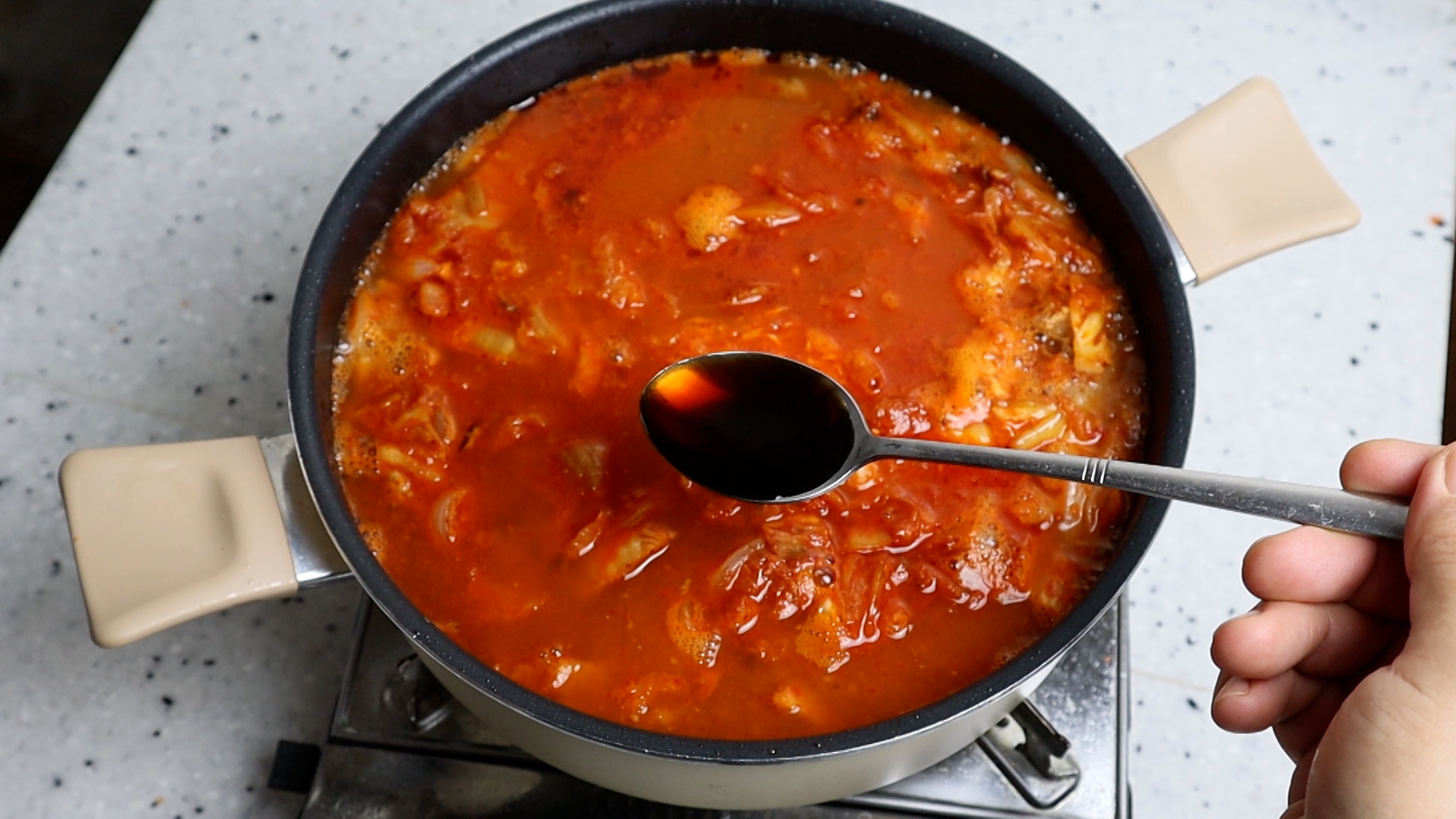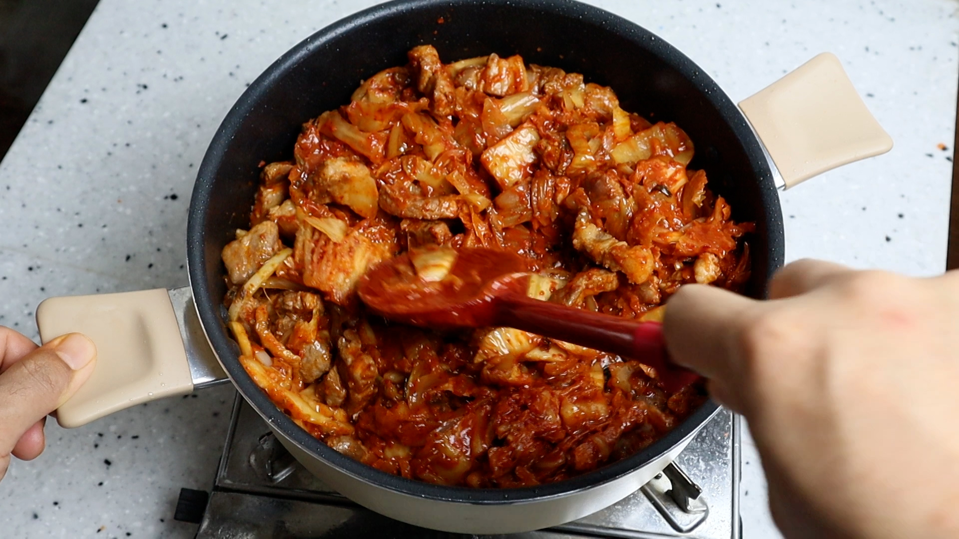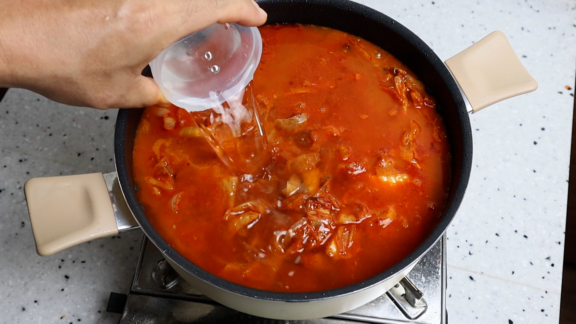 12. 고기기름에 볶음 김치에 맹물 6컵 1.2리터를 부어주세요.