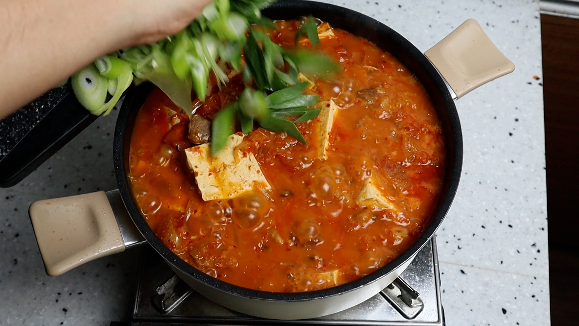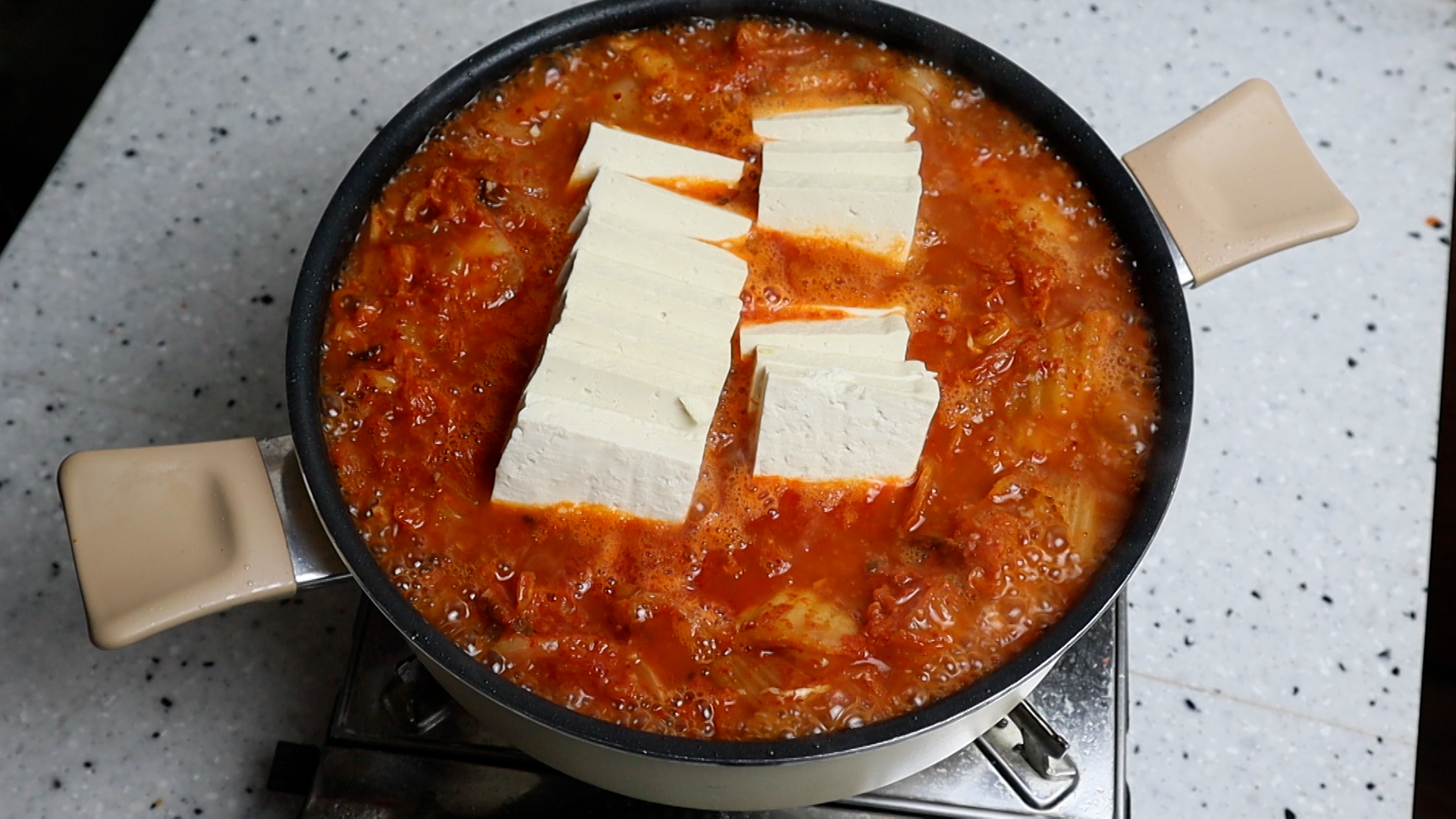 19. 두부를 넣고 국물이 끓어 오르면 불을 중불로 줄이고 15분간 끓여주세요.