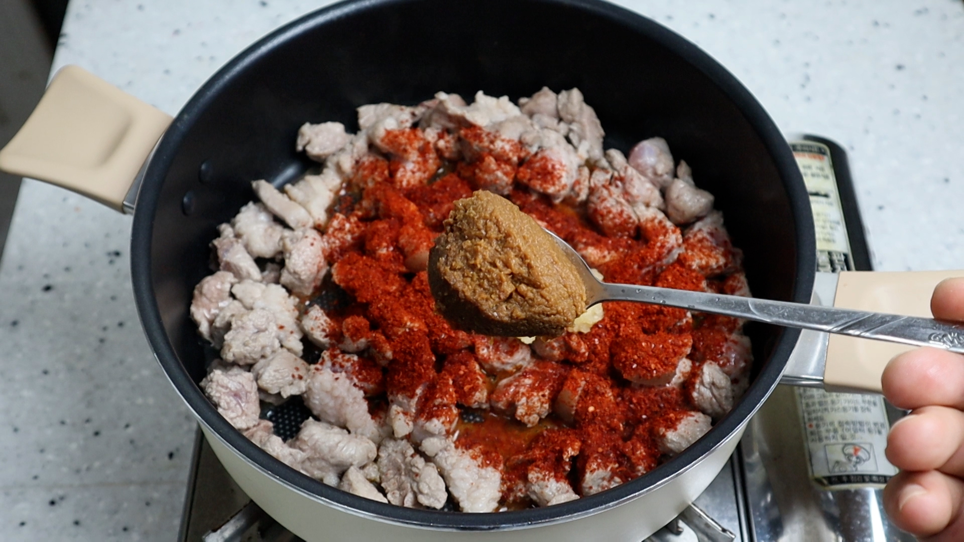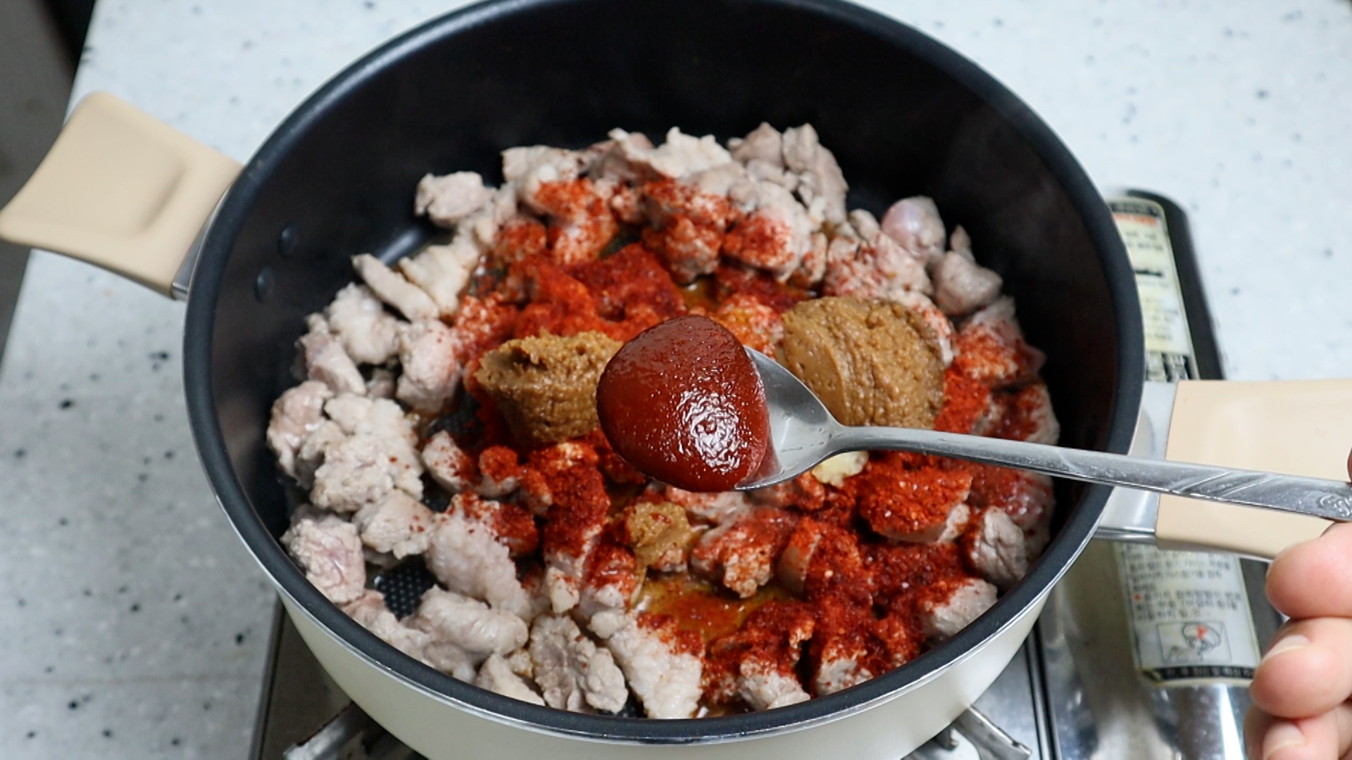 13. 고추장을 넣어서 칼칼하면서 살짝 매운맛을 보태주세요. 색감도 좋아진답니다.