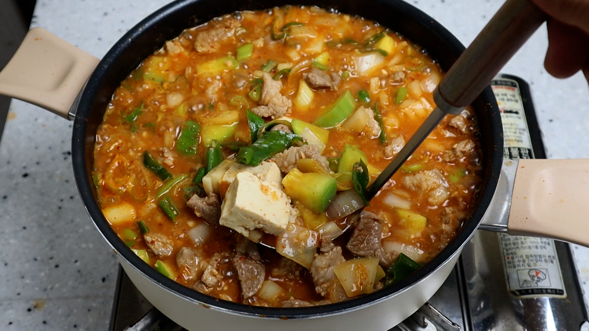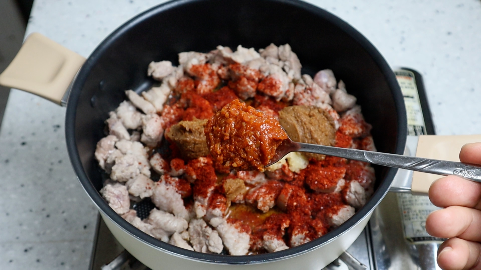 12. 쌈장을 넣어주세요. 쌈장은 기본적으로 양념이 되어 있어 적당히 섞어주면 찌개맛을 한층 좋게 해줍니다.