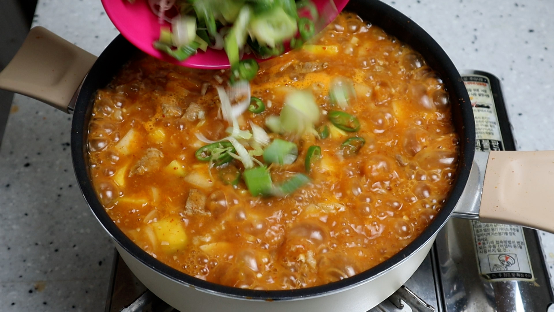 20. 대파와 땡초를 넣고 2분 정도를 더 끓여주세요.