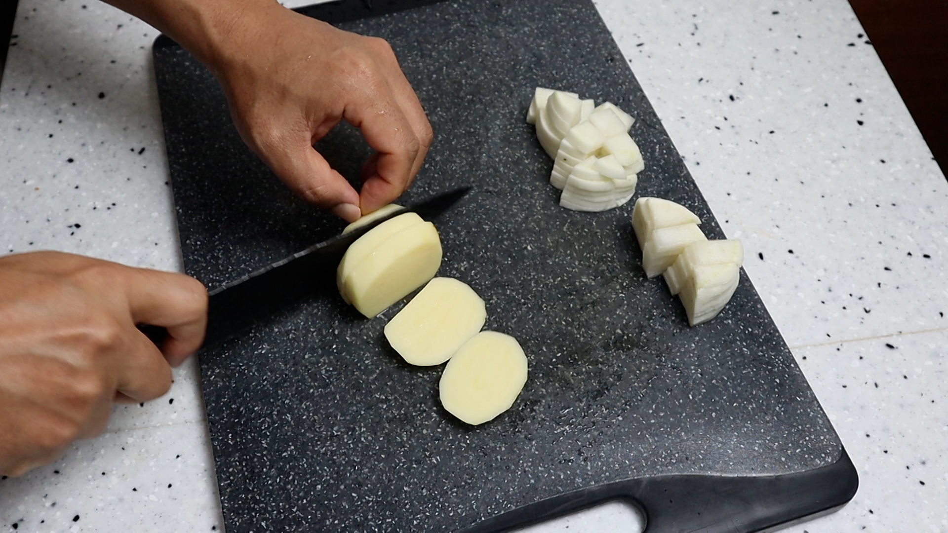 2. 감자는 두께 1cm 크기는 기호에 맞게 썰어주세요.